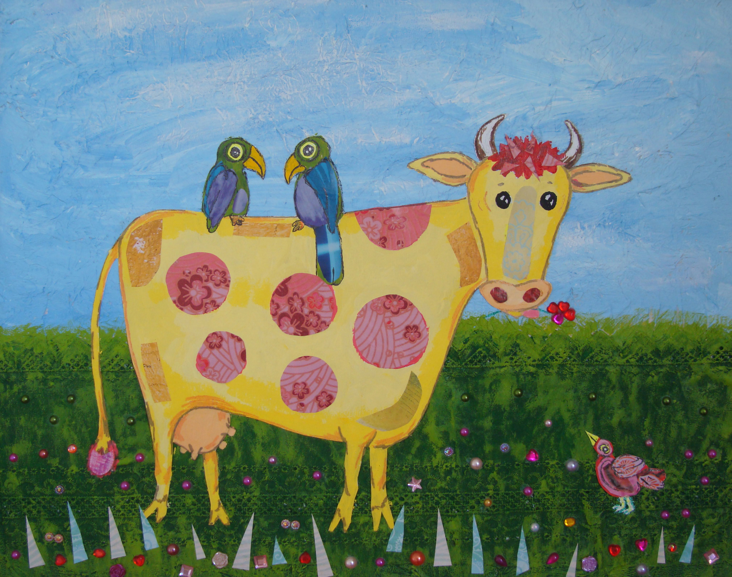 Koe met papegaai op rug, gemengde techniek op hardbord. Zit in een rode houten lijst. Geschikt om in kinderkamer op te hangen.