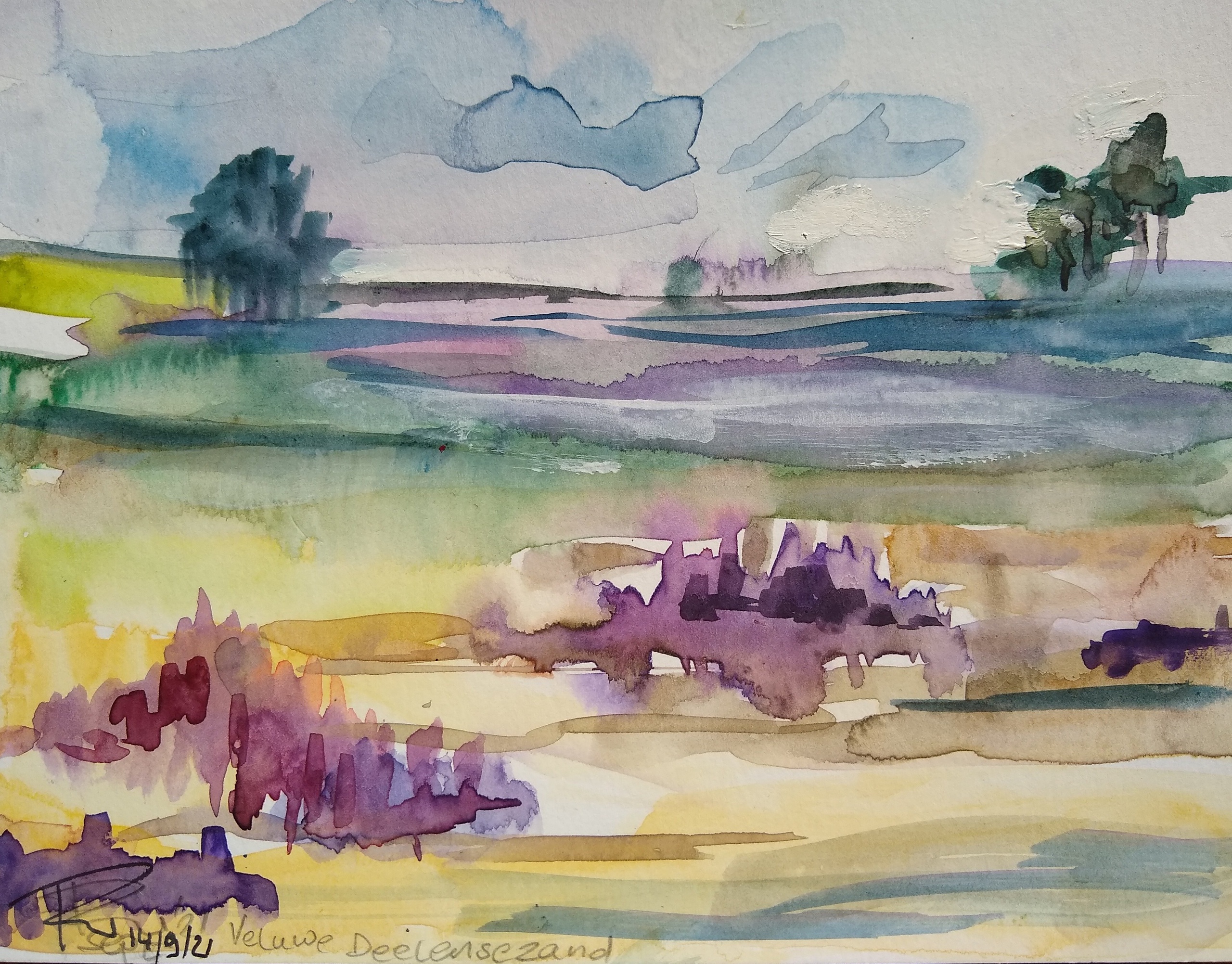 Een prachtige laagvlakte op de hoge Velewe met veel zand, lichte begroeiîng, wat heide en hier en daar wat struiken en boompjes.