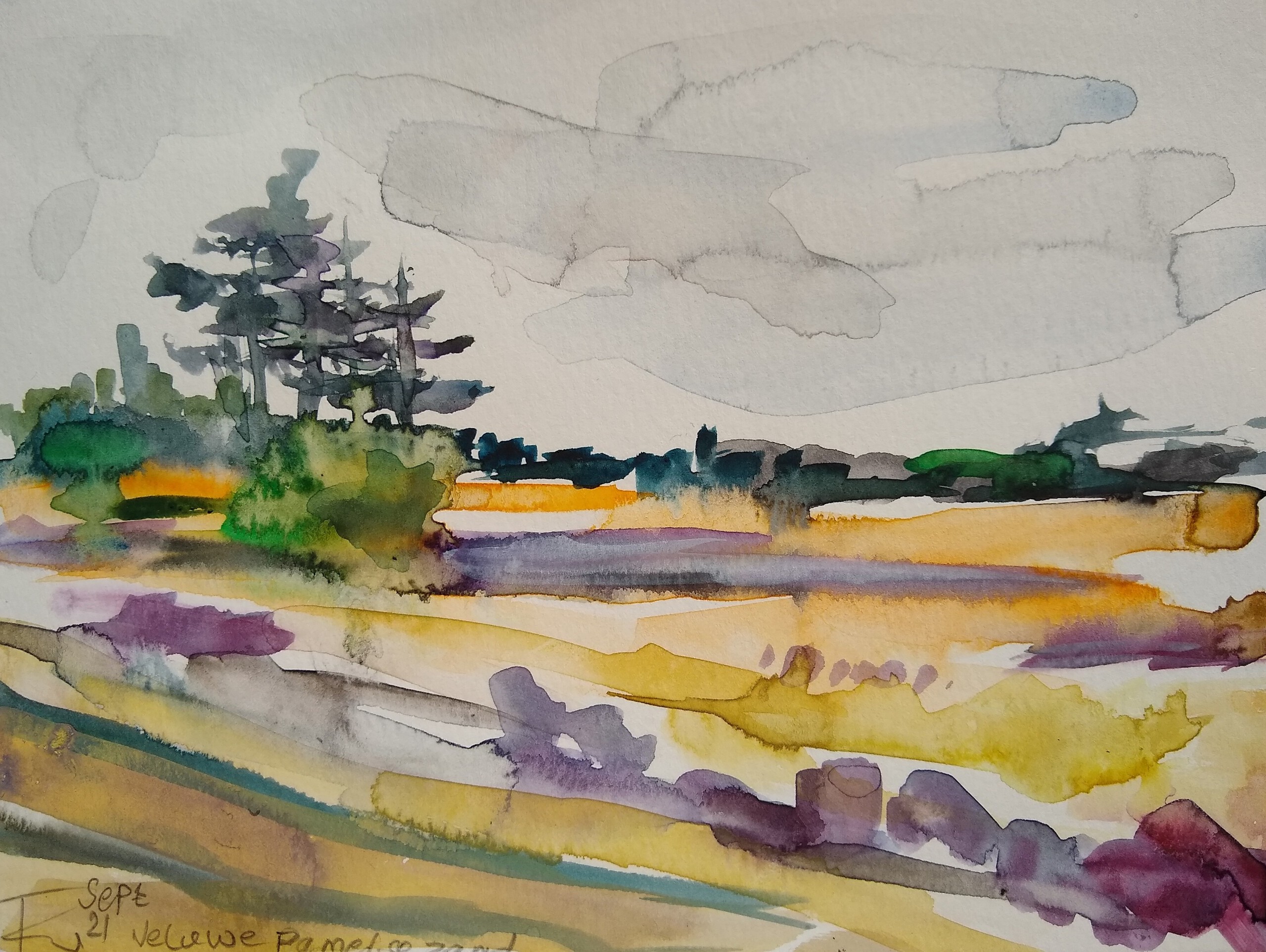 Een prachtige vlakte op de hoge Velewe met veel zand, liets meer lage begroeiîng, wat heide en al wat meer struiken en (dennen)boompjes.