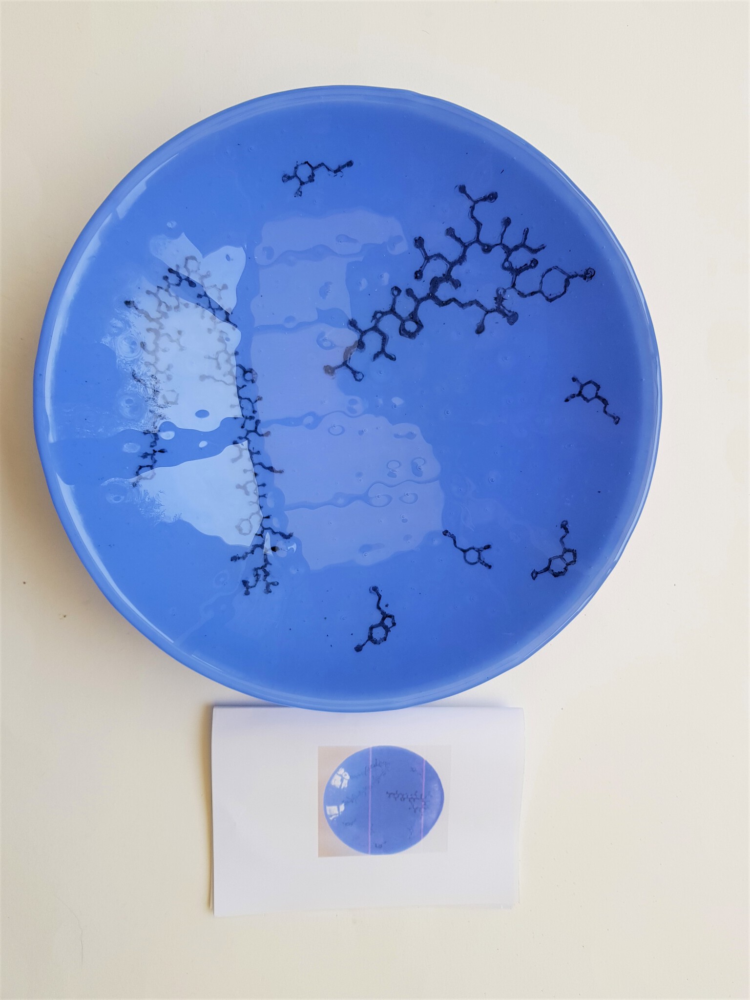 Deze mooie blauwe schaal is gemaakt via de glasfusing en brandschilder techniek. Er zijn 4 happy molecules in verwerkt: Dopamine, Serotonine, Endorfine en Oxytocin. Er zit een handgemaakt boekje bij over het maakproces en de molecule-uitleg. ( boekje is handmade, dus niet perfect) Gewicht is 1078gram