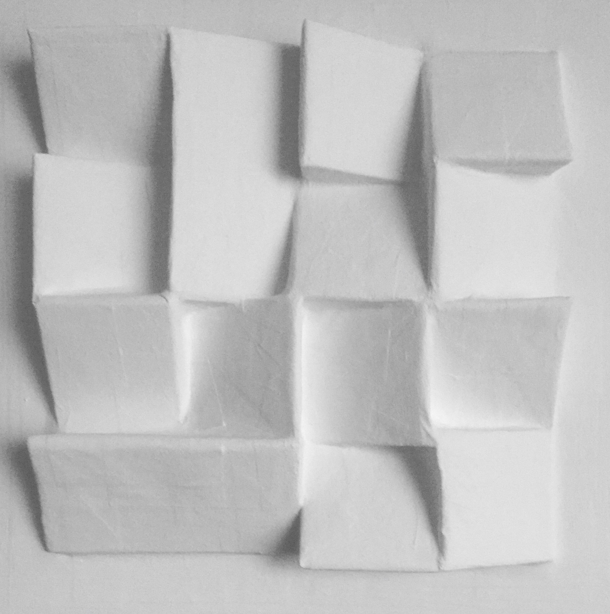 kleine compositie met vierkanten en rechthoeken papier, karton, acryl op mdf paneel in consignatie bij Galerie Rotor, Gorinchem