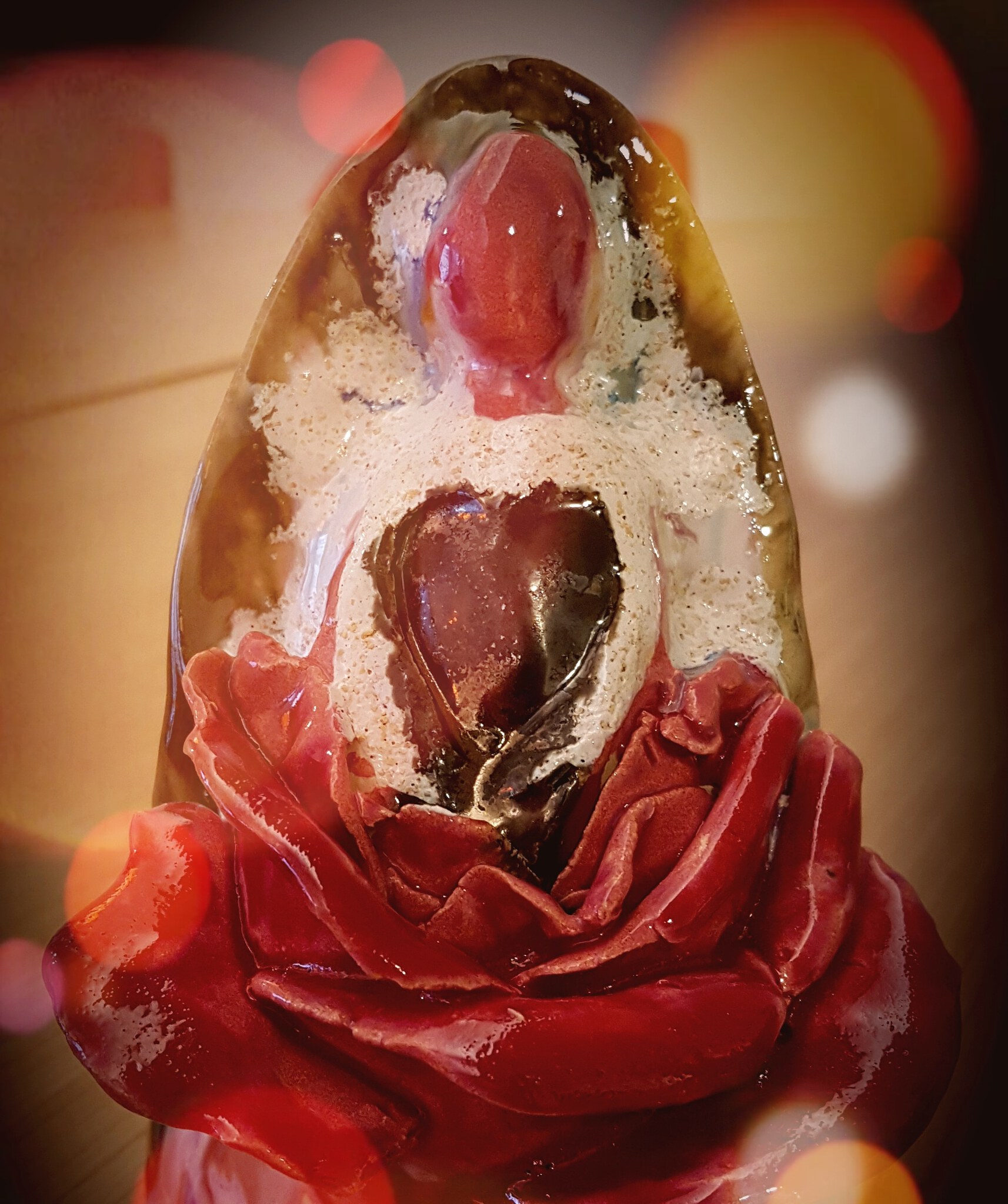 Dit beeld maakte in voor de vrouw. Omdat een aantal vrouwen om mij heen kanker, mn borstkanker, kregen en ik me daar zo machteloos in voelde. Hoe een lichaam je in de steek laat op het moment dat je ziek wordt. Maar als het niet ziek is lijkt het zo van zelfsprekend te zien. Dit vrouwenbeeld komt uit een roos, zacht en teer maar ook doorns ter bescherming. Een een beeldje ter verering van het lichaam, het lichaam dat jouw ziel draagt.