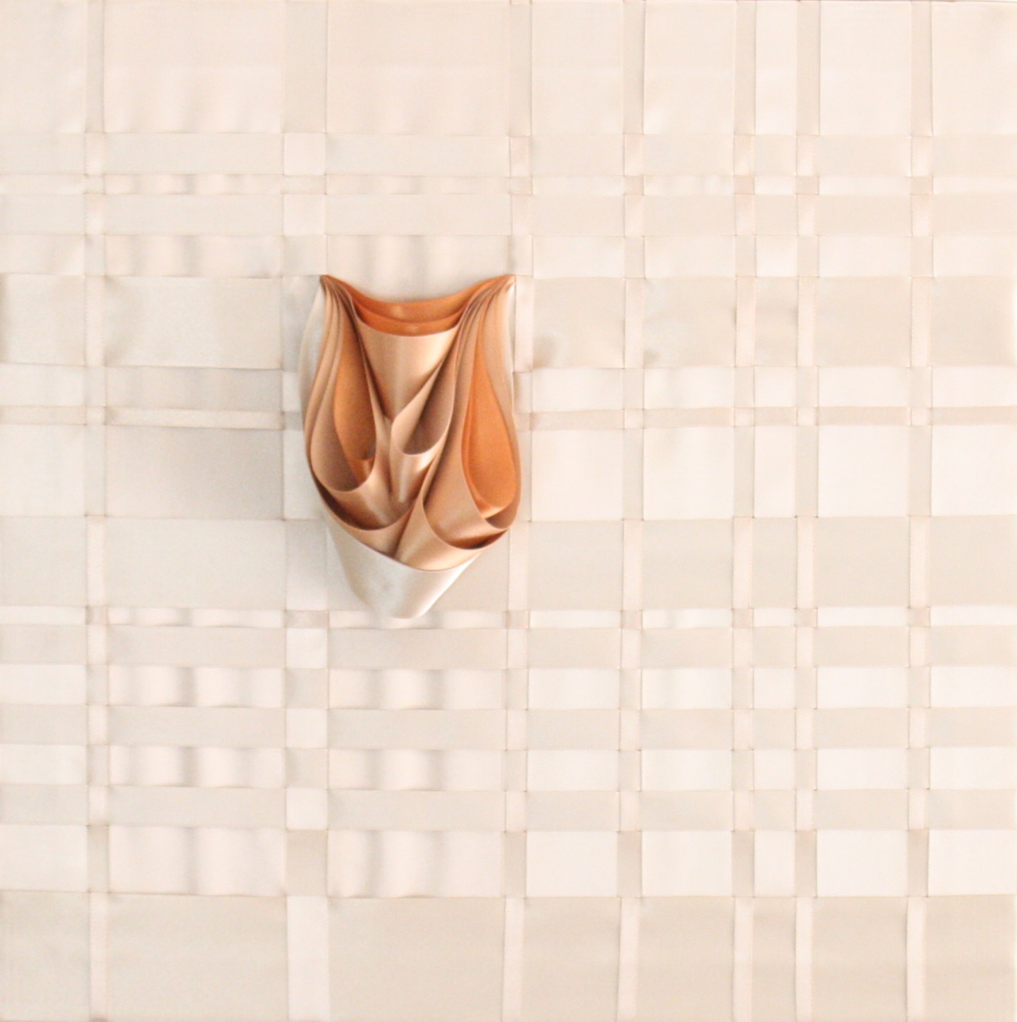 Gevlochten satijnlint in champagne kleur dat gespannen is op een houten frame van 40 x 40 cm met een druppel gevuld met lint in twee oranje kleurschakeringen.