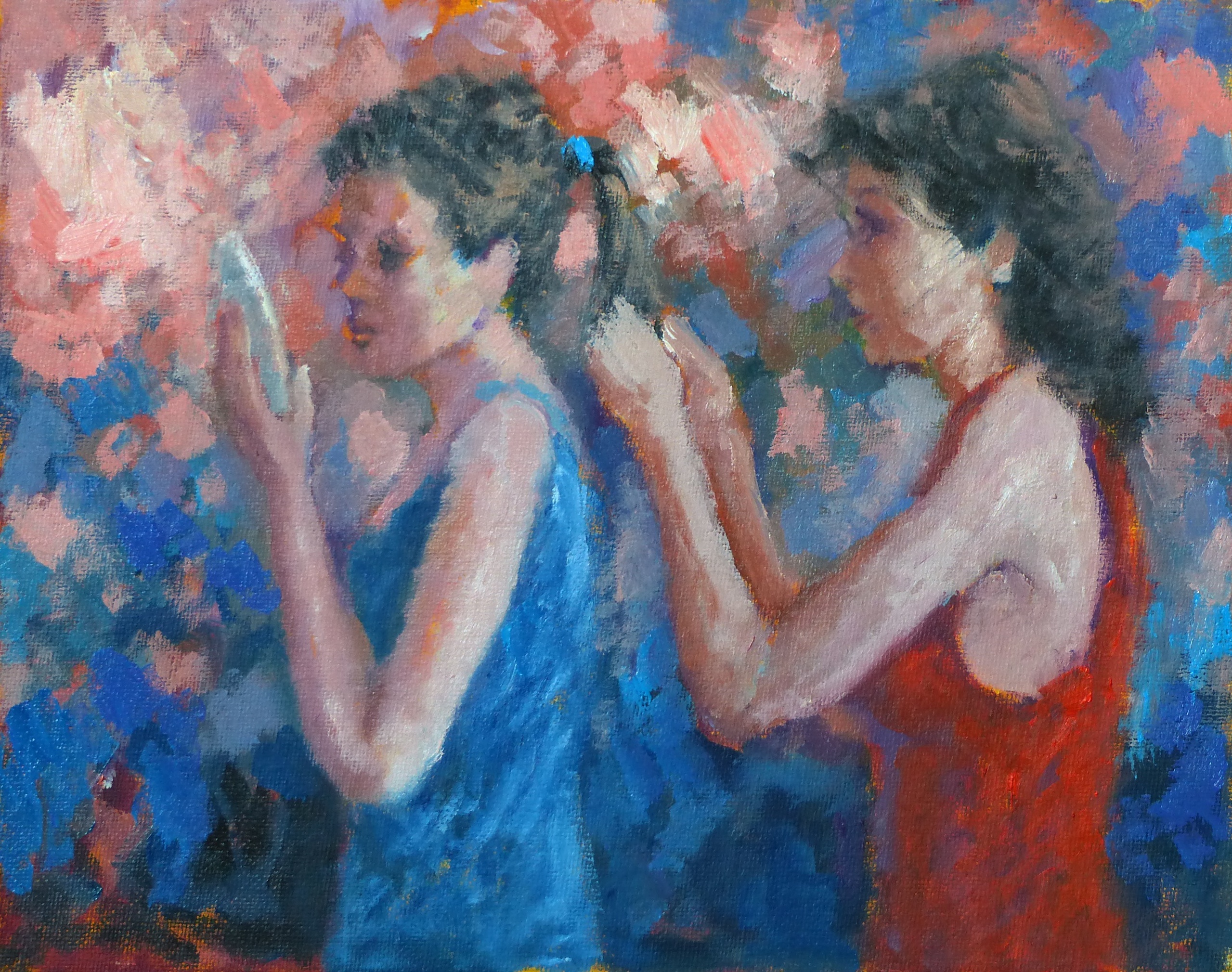 Hulp bij schikken kapsel. olieverf op canvasboard