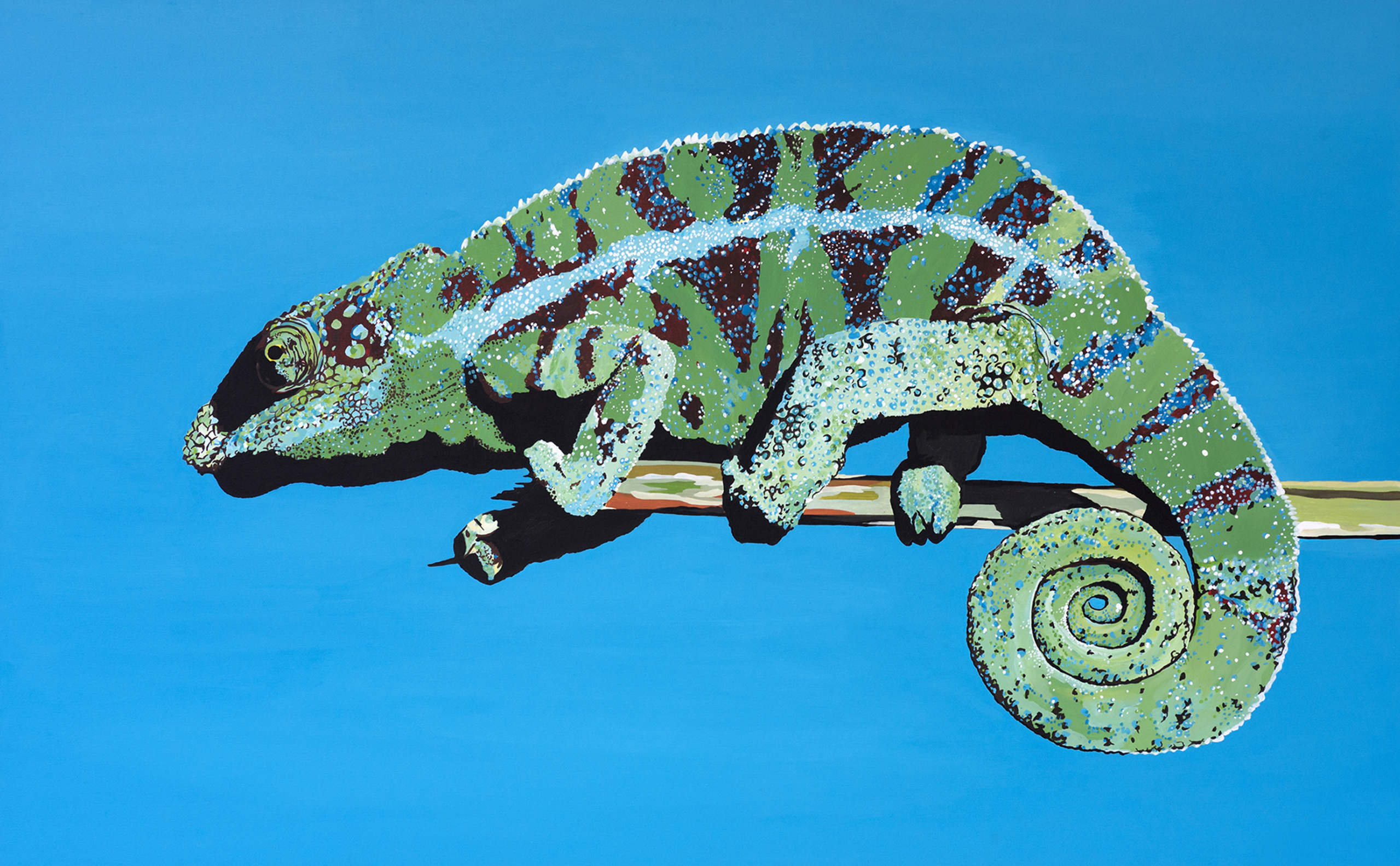 Portret van een cameleon in Madagaskar. 'Achterna zittende kleuren' Deze titel staat voor de 'verkleuring van de cameleon tegen zijn achtergrond. Dit werk is te zien in mijn atelier in Harderwijk