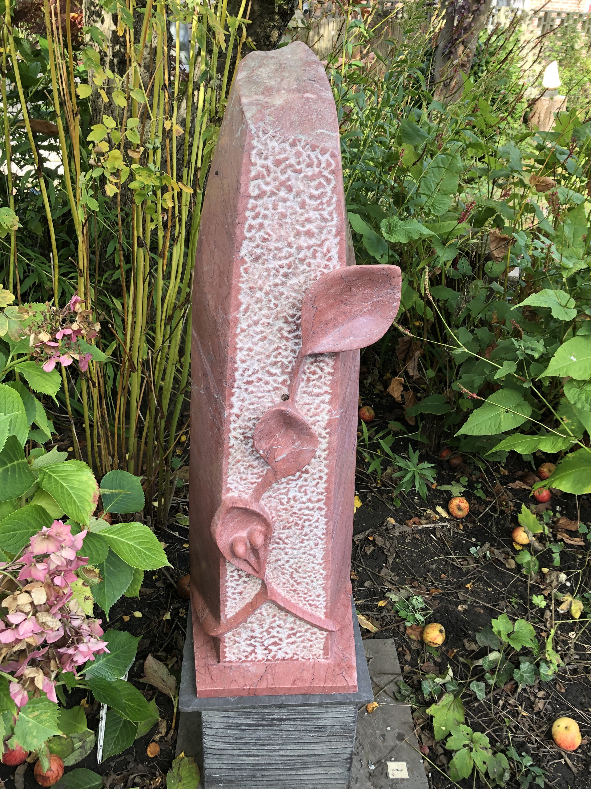 Steen van Parnon-marmer met symboliek: de doogaande lijnen zijn beide ouders, de bladeren de kinderen en de knoppen in één van de bladeren de kleinkinderen. Abstract
