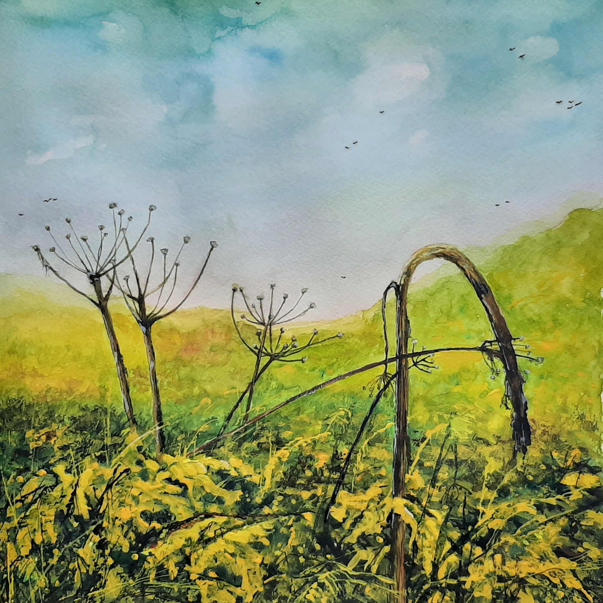 Soms kom ik tijdens mijn fietstochten prachtig bloeiende planten tegen. Zoals een heel veld reuzenberenklauwen tussen de Boekend en maasbree (Noord Limburg). Het is een invasieve exoot van een paar meter hoog vaak..Het sap van deze imponeren schermbloemige plant kan ernstige gevolgen hebben als het op je huid komt. Toen ik er passeerde waren de planten al over hun bloei-hoogtepunt heen. Het aquarel is gemaakt op 300grams Canson Montval papier. De vermelde prijs is exclusief lijst, glas en/of passe-partout.