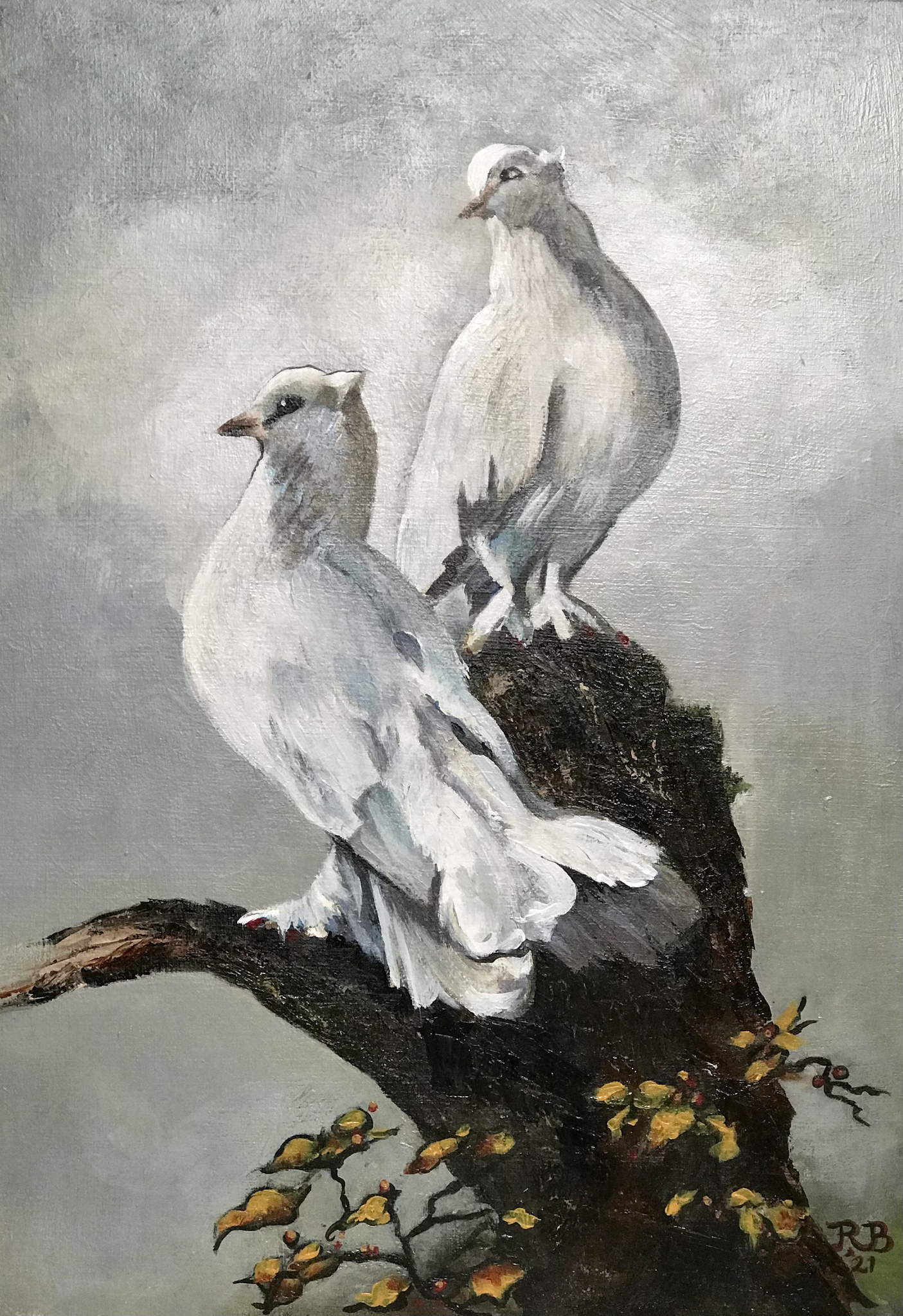 Art White Witte Opdracht Duiven Pigeons Doves Duivenpaar Pauwstaart Indiasepauwstaart Duivenschilderij