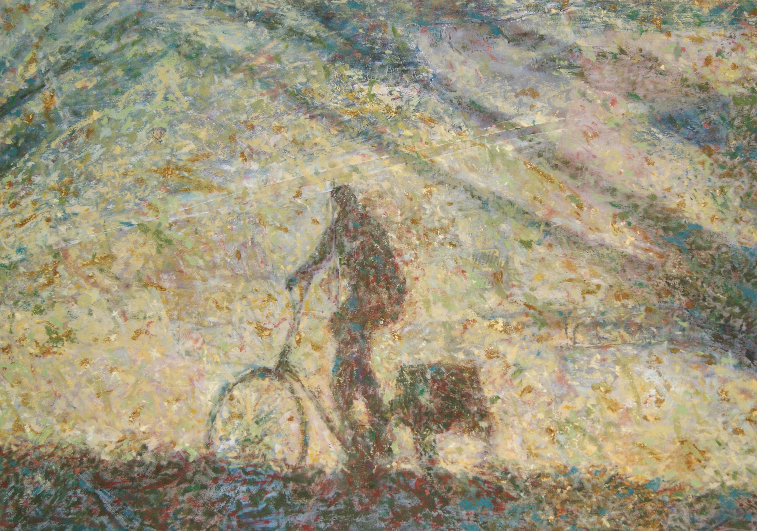 Op weg naar het atelier in Oirschot. Mijn schaduw op de fiets