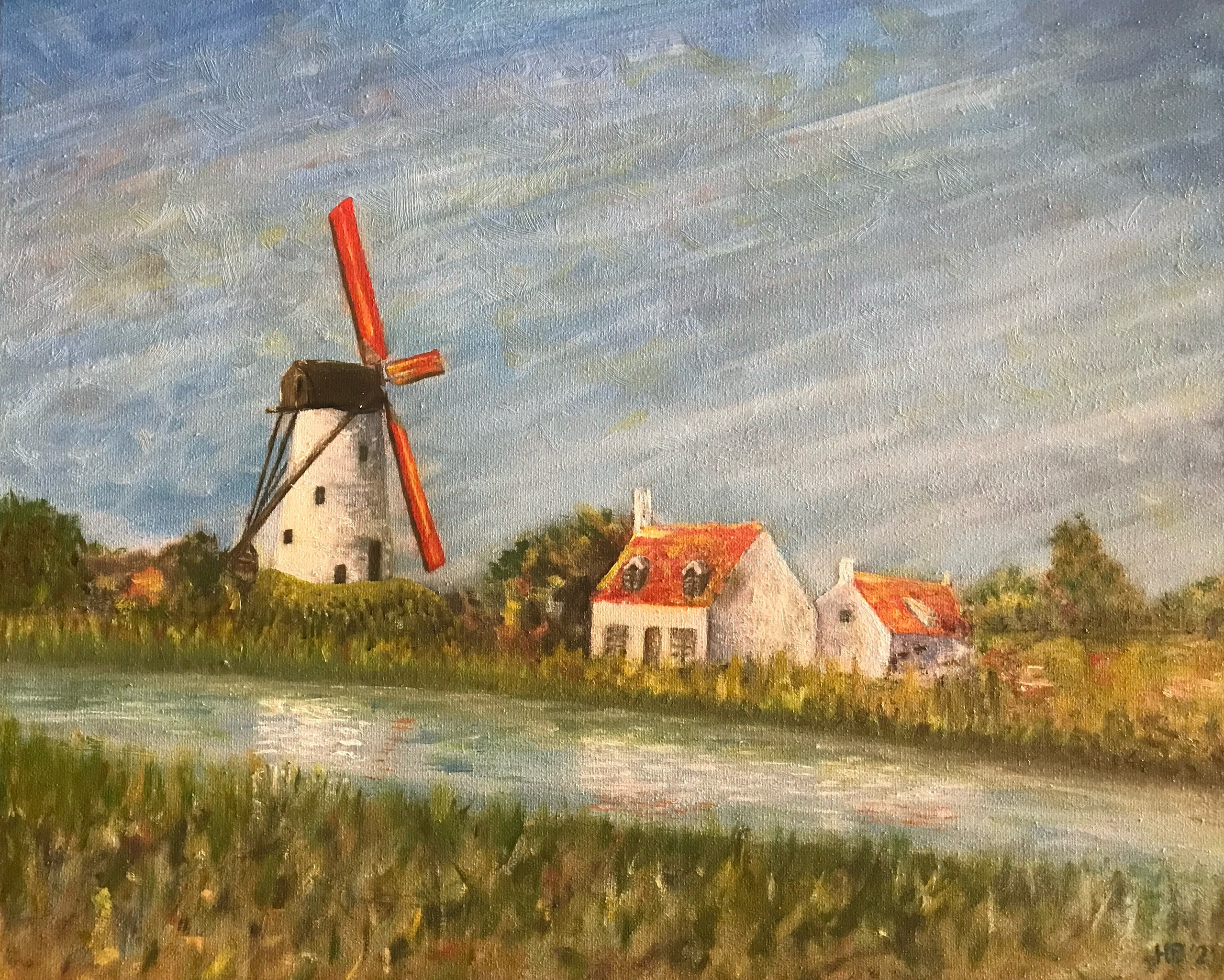 Geabstraheerd geschilderd naar eigen foto. Stenen, witgepleisterde windmolen ook wel "bergmolen' genoemd. Dateert uit 1867 en staat langs de Damse Vaart, tussen Damme en Brugge.