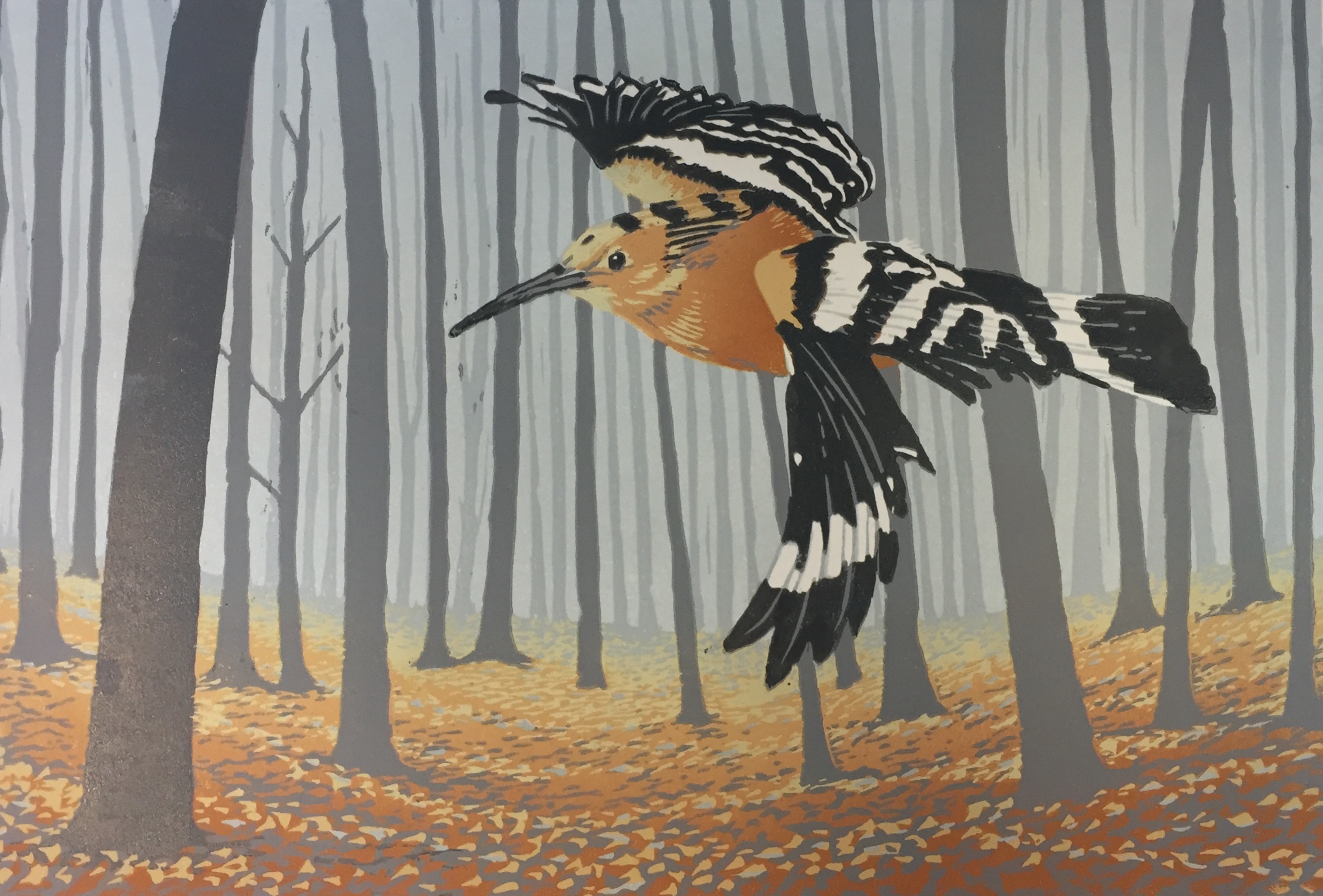 Een hop in nevelig herfstbos. Lino in 6 kleurlagen, gedrukt in oplage van 10 stuks. Uitverkocht.