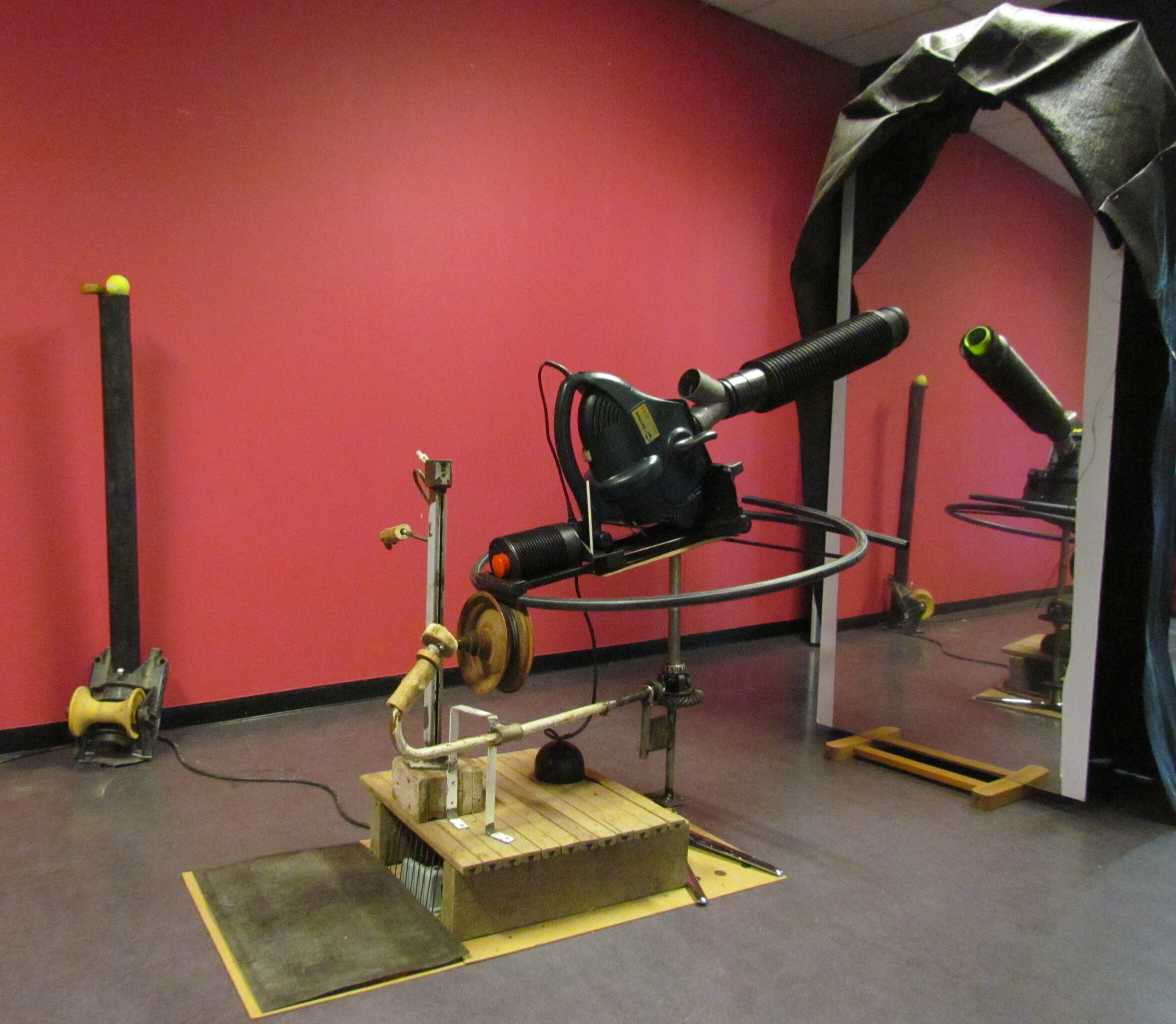 Schieten op een ander staat vaak gelijk aan schieten op jezelf. Deze oude bladblazer is omgebouwd tot ballenkanon en geplaatst voor een kast met een magic mirror of confrontatiespiegel. Neem plaats en schiet op je eigen evenbeeld in de spiegel of kruip achter de spiegel en zie hoe er op je wordt geschoten.