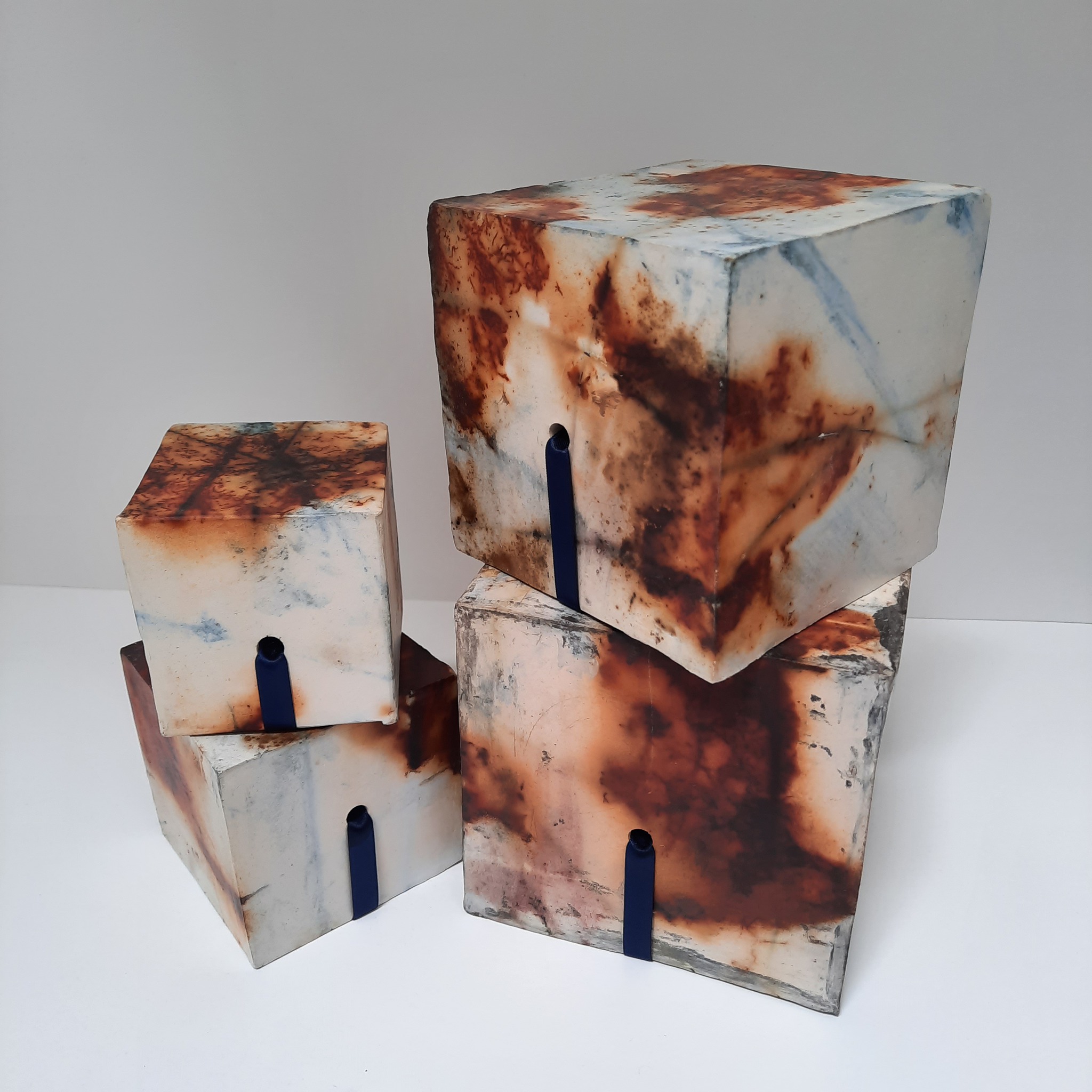 Deze blokken toren is gemaakt van chamotte klei. De kleuren zijn ontstaan door het voorwerp te omwikkelen met diverse materialen, die na verbranding in de saggar hun kleurstof afgeven aan het voorwerp. Deze materialen kunnen o.a zijn: koperdraad, mangaan, staalwol, bananenschillen. De blokken hebben allemaal een blauw lintje aan één kant, die loopt van gat naar gat. Ze kunnen naar eigen inzicht los of op elkaar gezet worden. Grootste is 13 x 13 cm, kleinste 7 x 7 cm.
