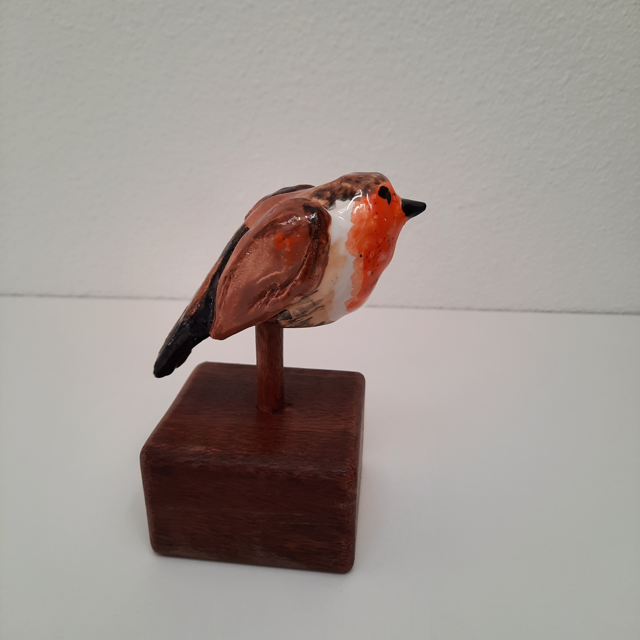 Dit Roodborstje is gemaakt van chamotte klei en bewerkt met diverse kleuren glazuur. Het vogeltje staat vast op een houten sokkeltje.