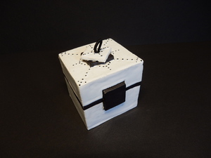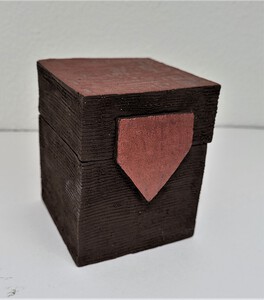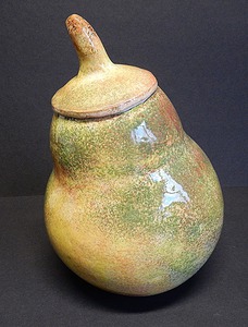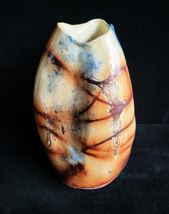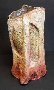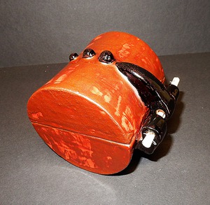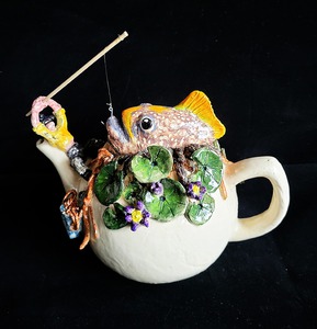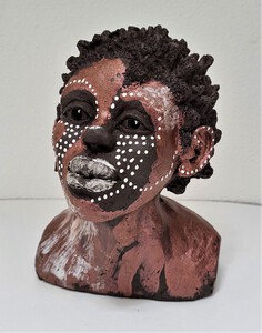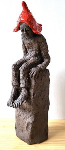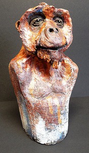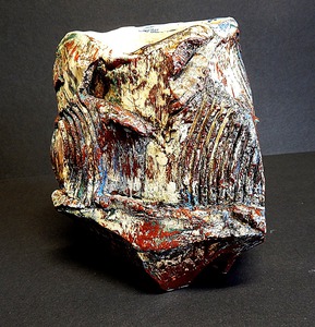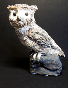 Deze griebel is gedeeltelijk gemaakt uit zwartbakkende chamotte klei en gevonden hout. De klei is bewerkt met pigmenten en licht geglazuurd. De houten huid is licht gekleurd met acryl.