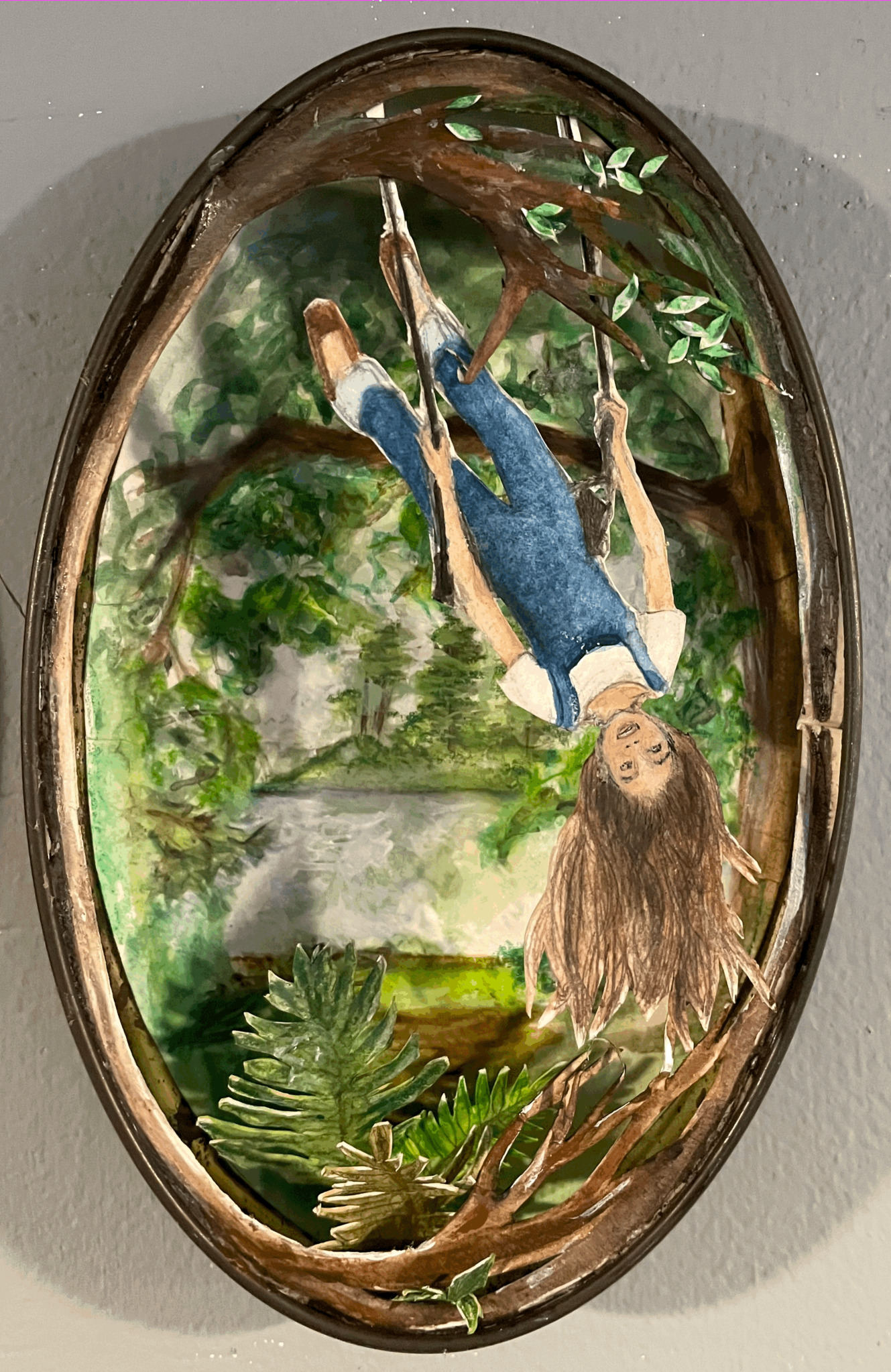 Papieren 3d diorama in ovalen blikje, getekend op aquarelpapier.