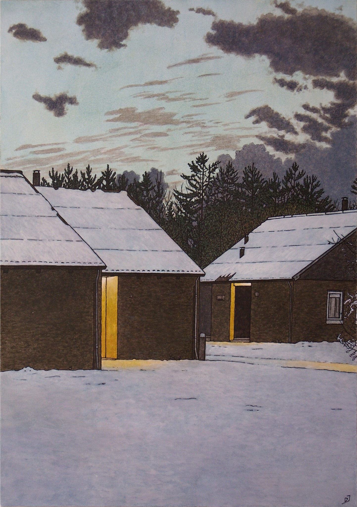 Uitzicht vanuit bungalow op een besneeuwd vakantiepark tijdens de schemering.