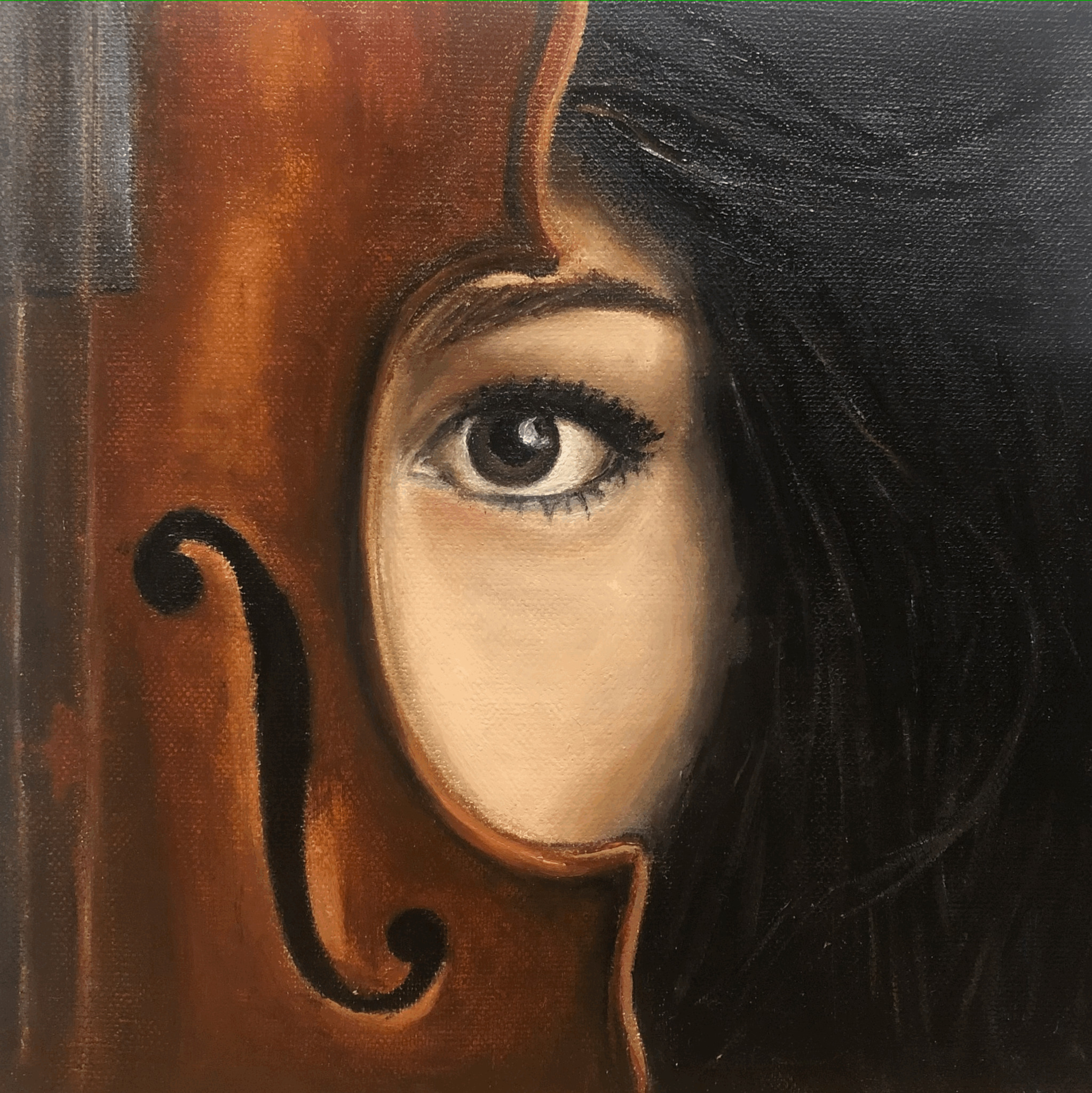 Olieverf op doek, uitsnede van violiste met viool. Geschilderd naar een foto.