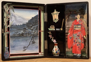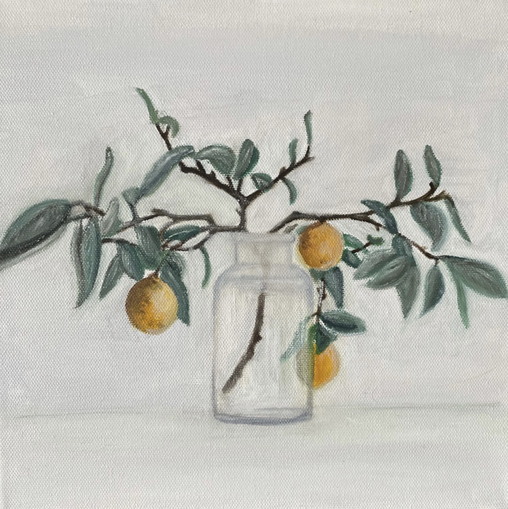 Olieverfschilderij van takken van een citroenboompje in glazen flesvaas.