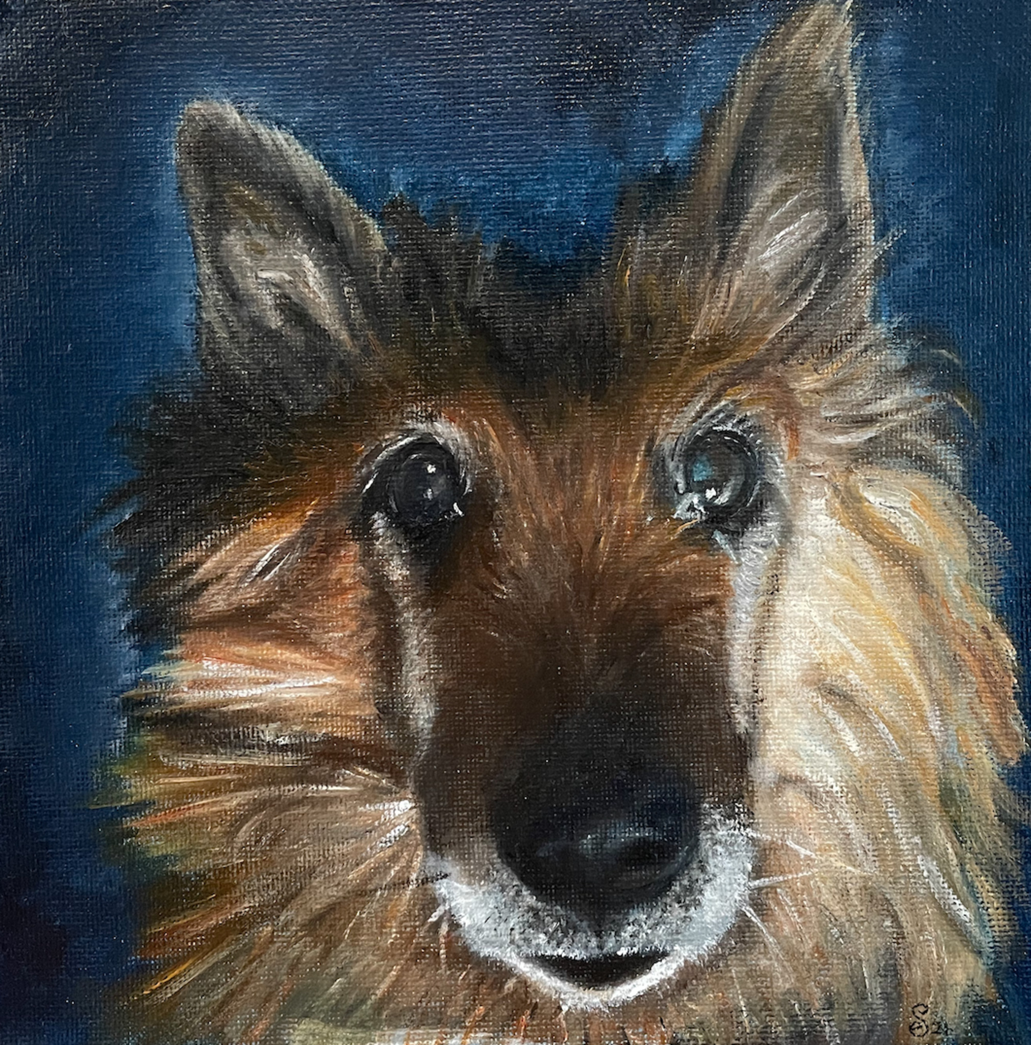 Olieverfportret in opdracht van 'bejaarde' herdershond. Deze lieve viervoeter heeft prachtige, weemoedige ogen.