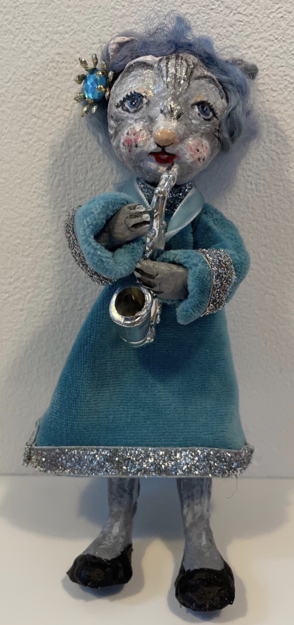 Kersthanger gemaakt van papier maché en paperclay, Jurkje is van velours, afgezet met lint. Figuurtje is beschilderd met acrylverf en liquitex transparante lak. Haar is van wol. Instrument en haarbloem van kunststof.