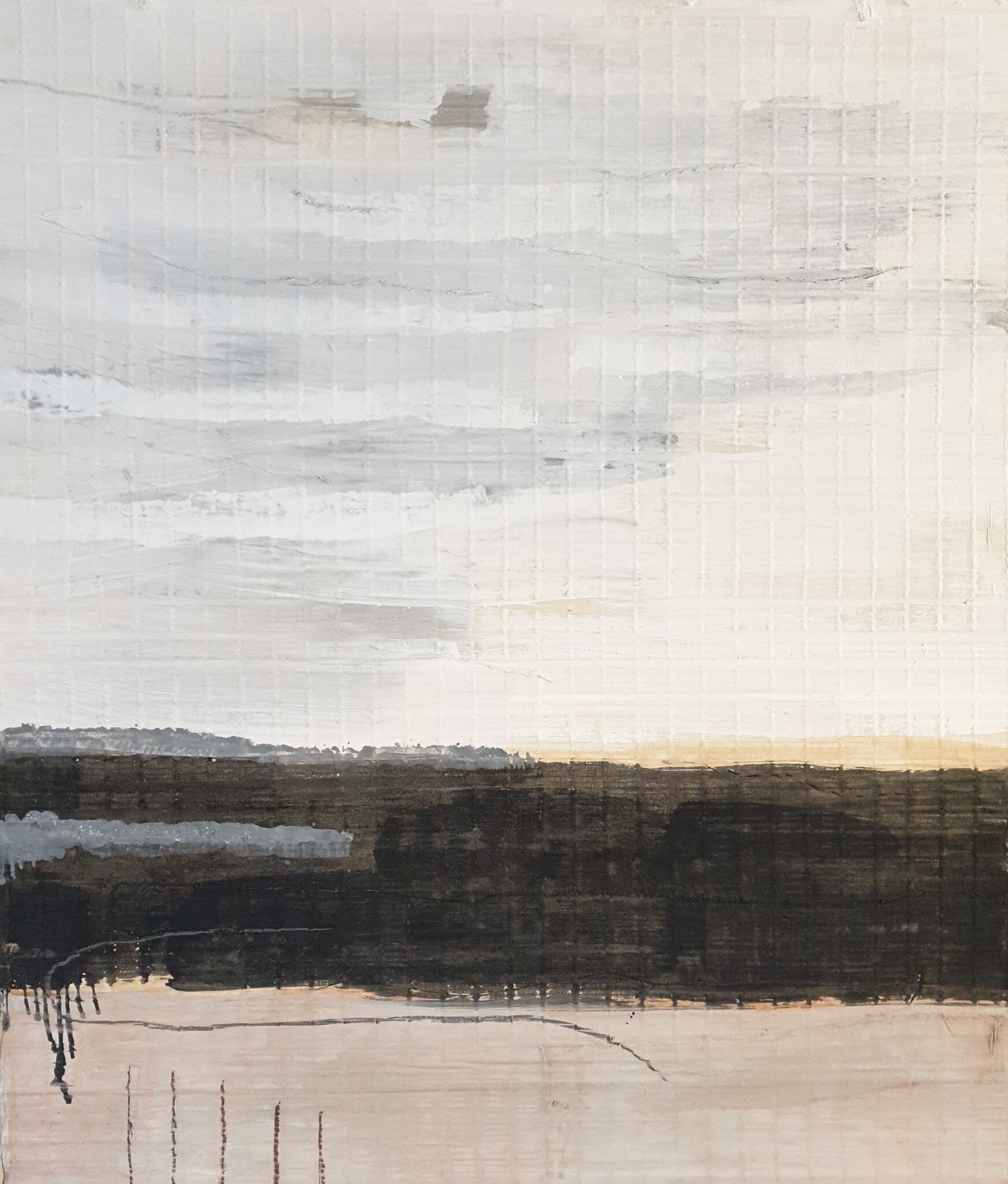 landschappen. Poëtisch maar ook vervreemdend. Met humor en onverwachte wendingen. De kern van de compositie wordt gevormd door grote vormen met een krachtige uitstraling , toegevoegd worden kleine details waardoor je al lopend door het schilderlandschap stuit op onverwachte ontdekkingen.