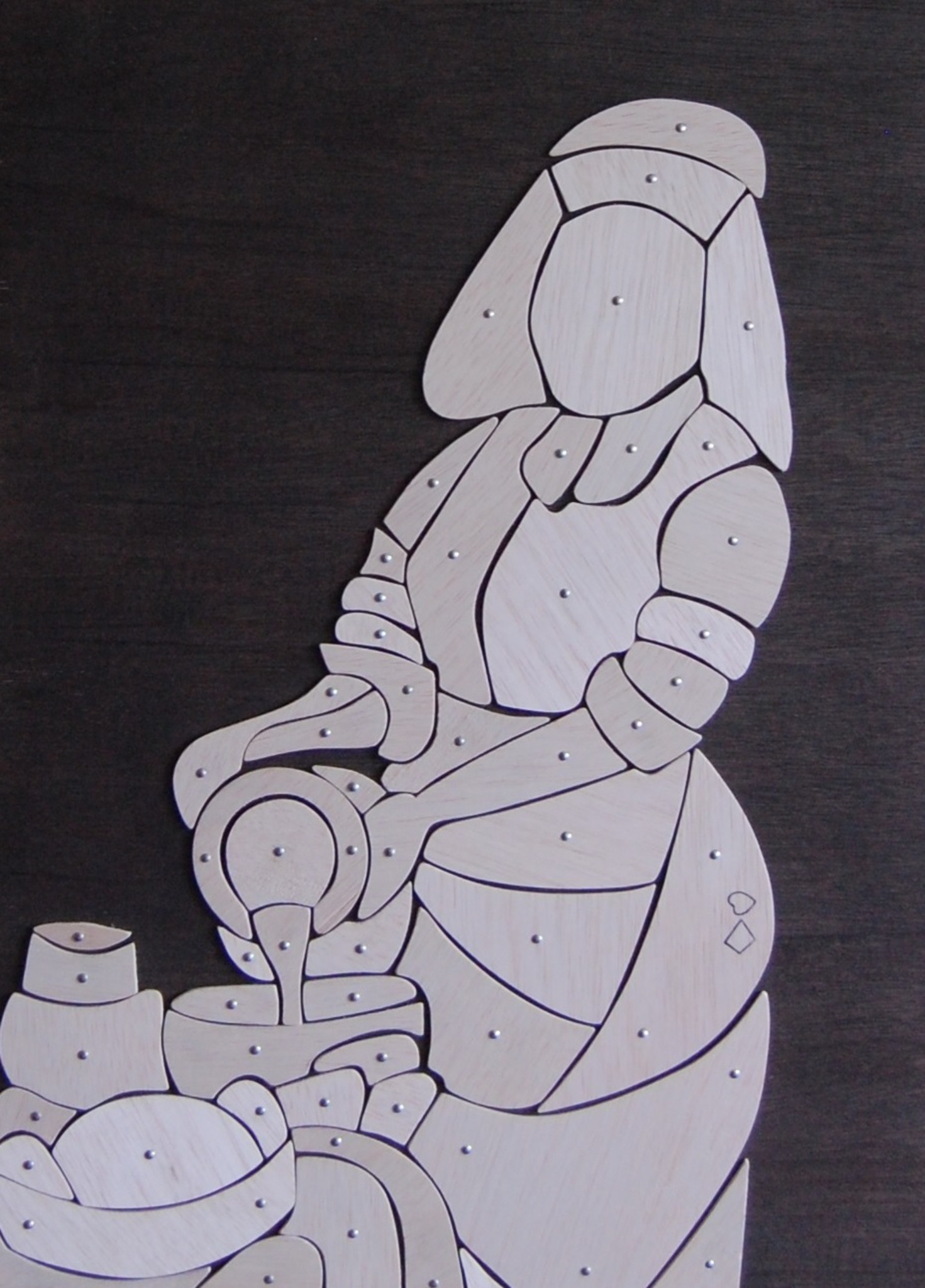 Een abstracte versie van het bekende melkmeisje uitgevoerd met dun blank hout en zilveren spijkers op een houten zwart gebeitste plaat.