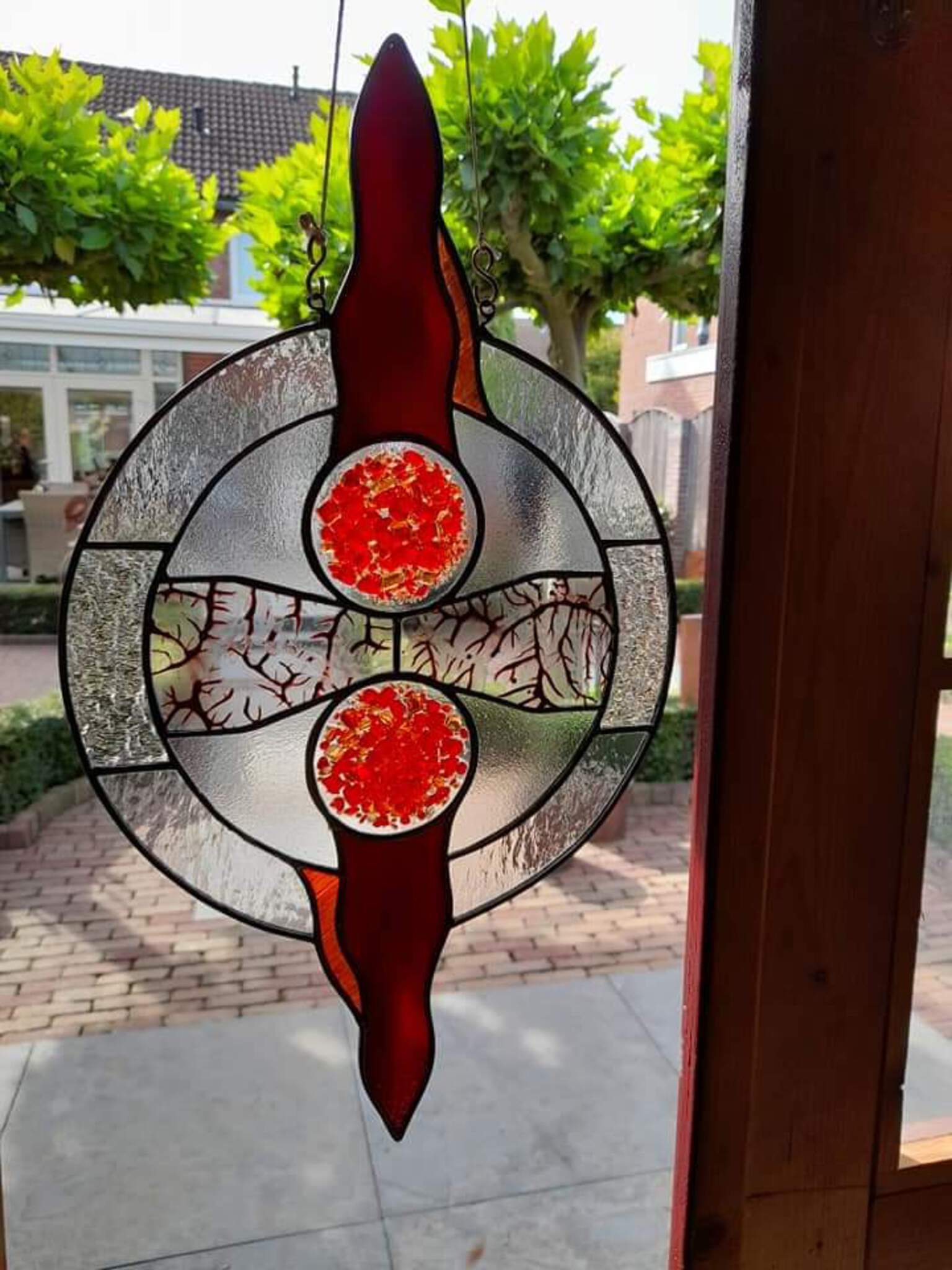 Glashanger met diversen soorten glas volgens de tiffanytechniek.