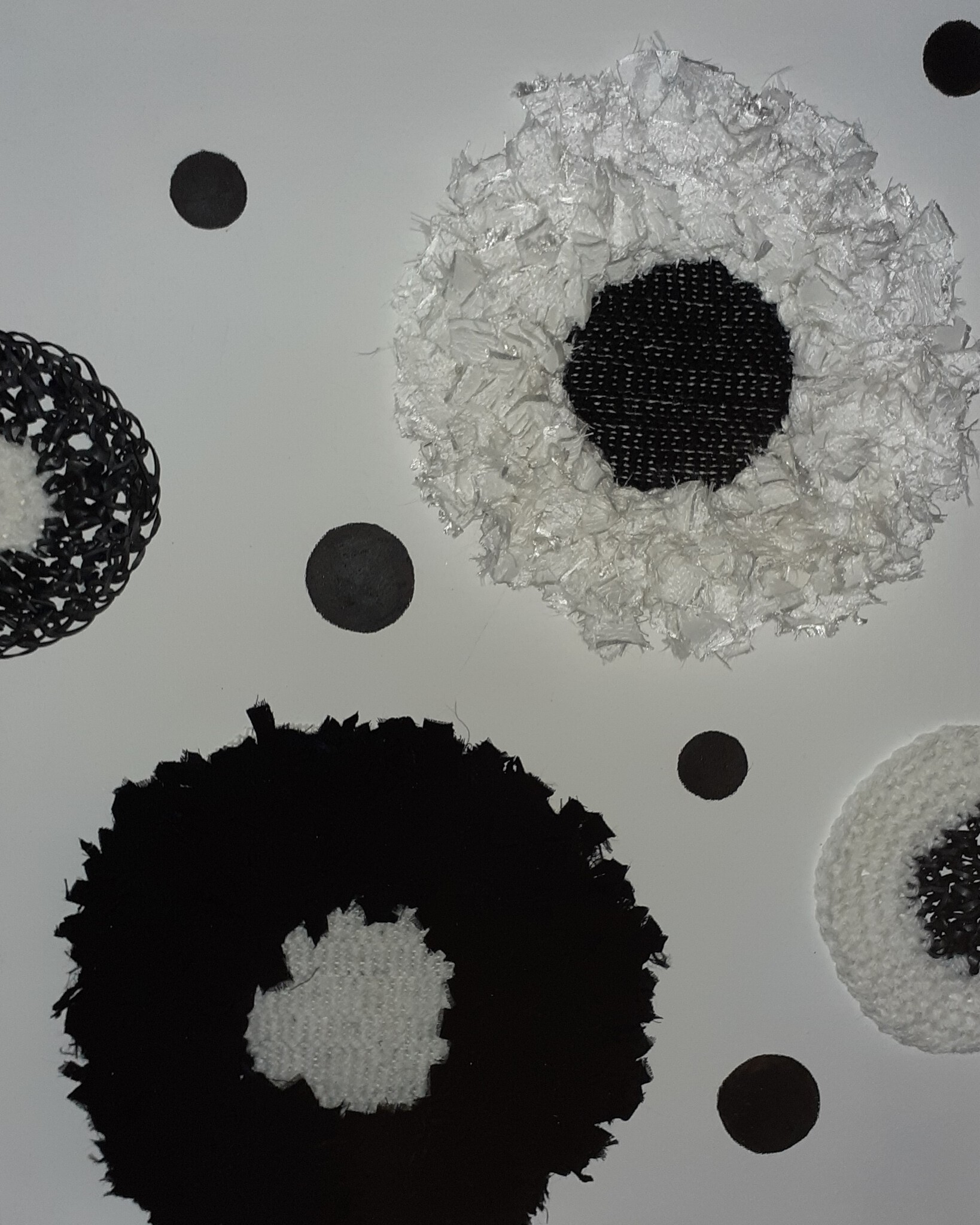 In dit schilderij zitten fietsband, lapjes, wol en acrylverf verwerkt.