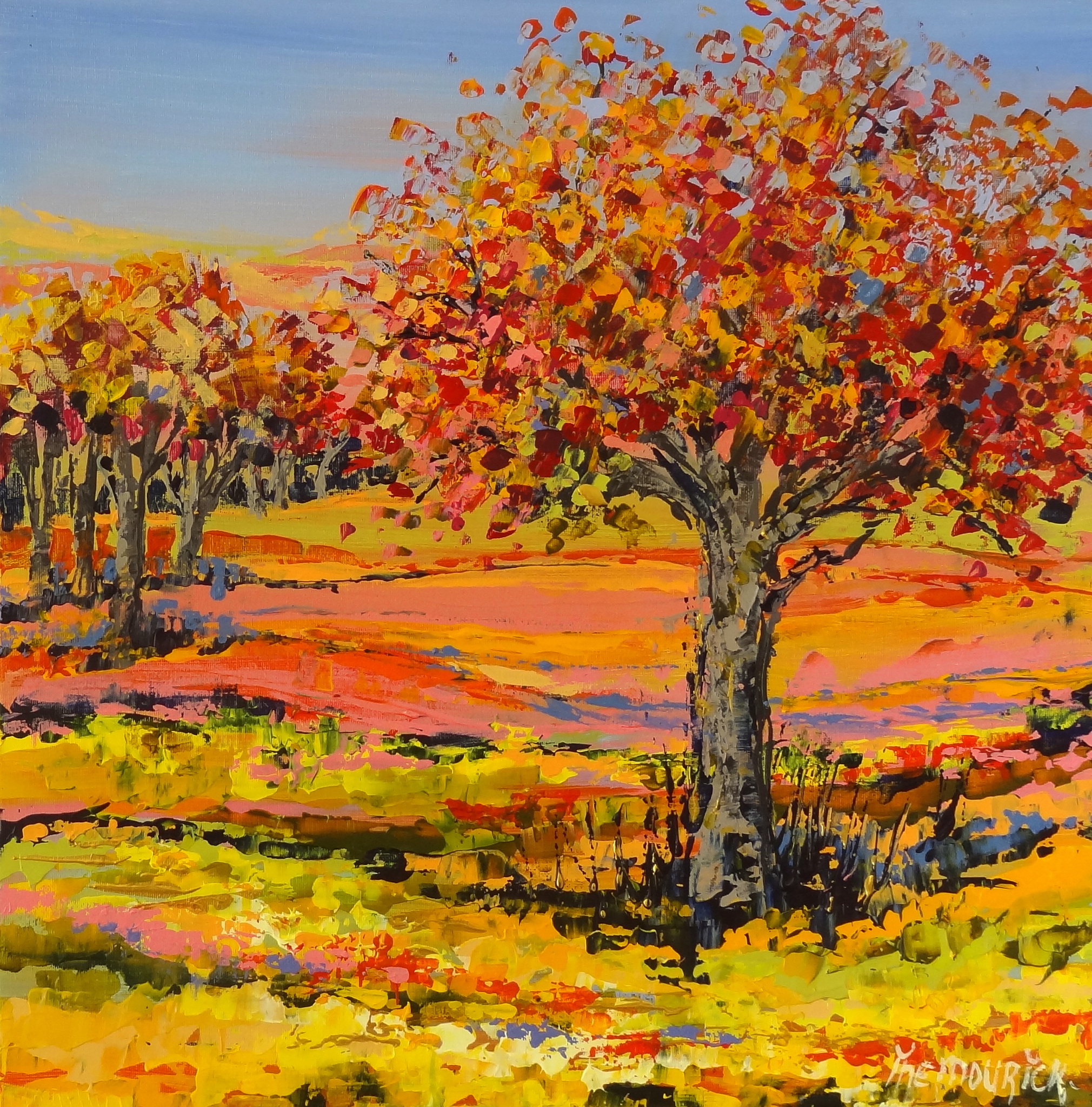 Expressief herfst landschap met kleurrijke bomen en glooiende heuvels. Mijn inspiratie: de herfst met al zijn uitbundige kleuren. In de korte tijd, na de zomer en wanneer de bladeren nog aan de bomen zitten, kunnen de bladeren de meest fantastische kleuren hebben. Dat kan variëren van donker rood, roze tot helder geel. Als het begint te regenen en stormen, later in het seizoen, is deze kleuren pracht weer verdwenen, maar tot dan kan iedereeen genieten van deze kleurenpracht. Incl. houten baklijst in de kleuren zwart en zilver.