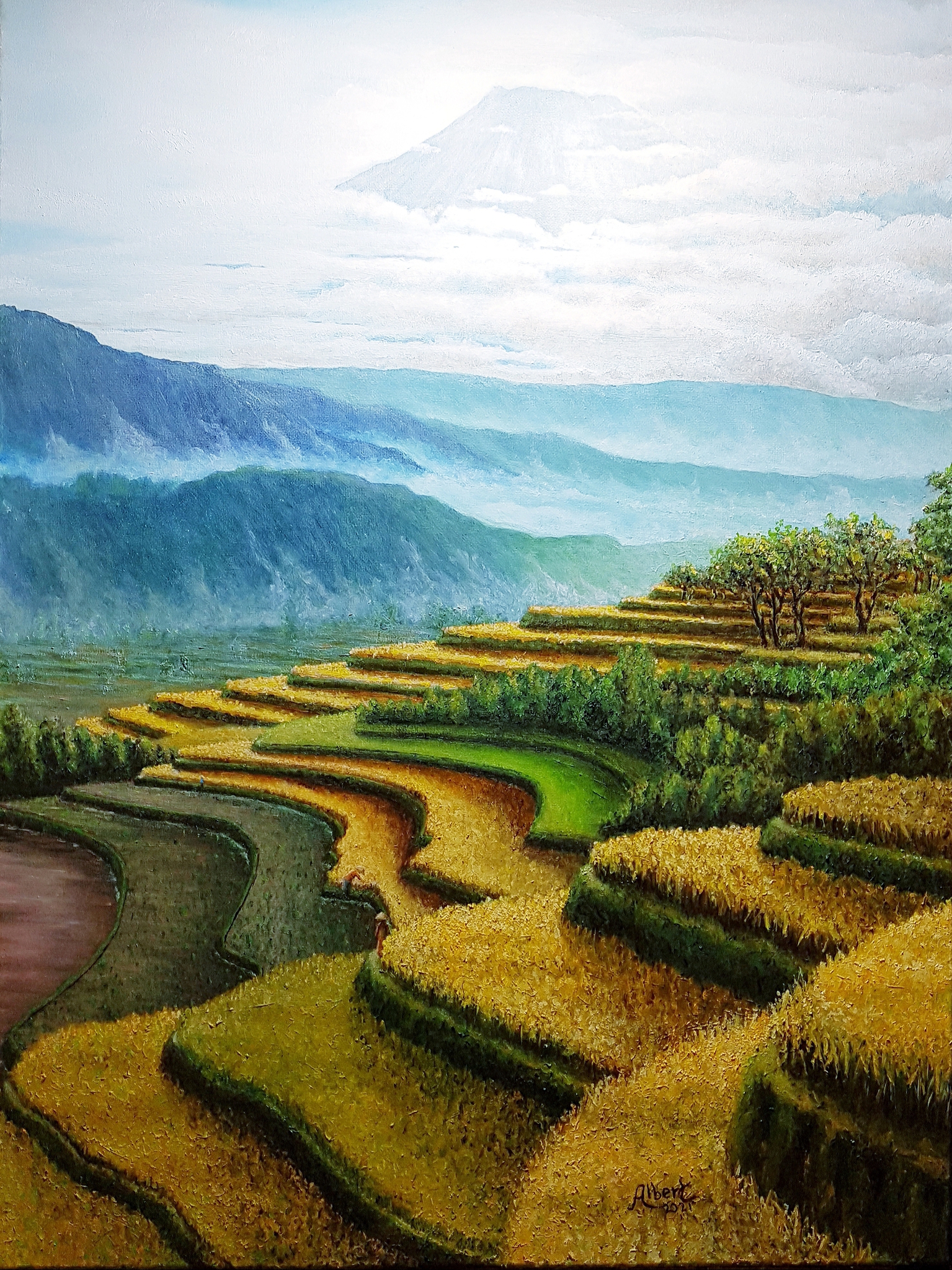 Schilderij Olieverf Vulkaan Sawah Gunung Sumbing