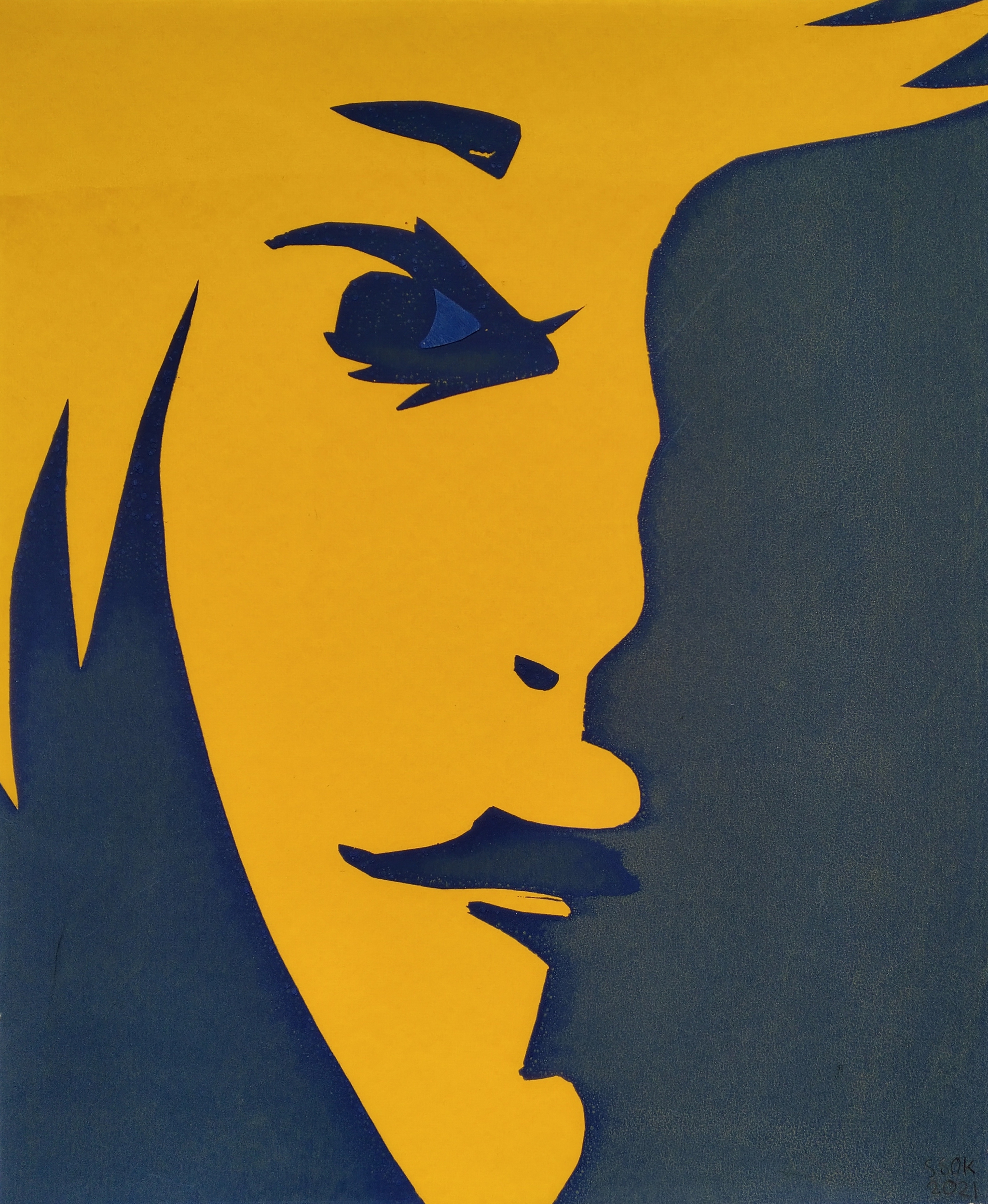 Het is een zeefdruk, maar dan anders. Eerst heb ik een geel vlak afgedrukt en daar een gezicht van geknipt papier opgelegd. Het donkerblauw drukte ik er overheen waardoor het gezicht geel bleef. Er is maar 1 afdruk van, een unicum.
