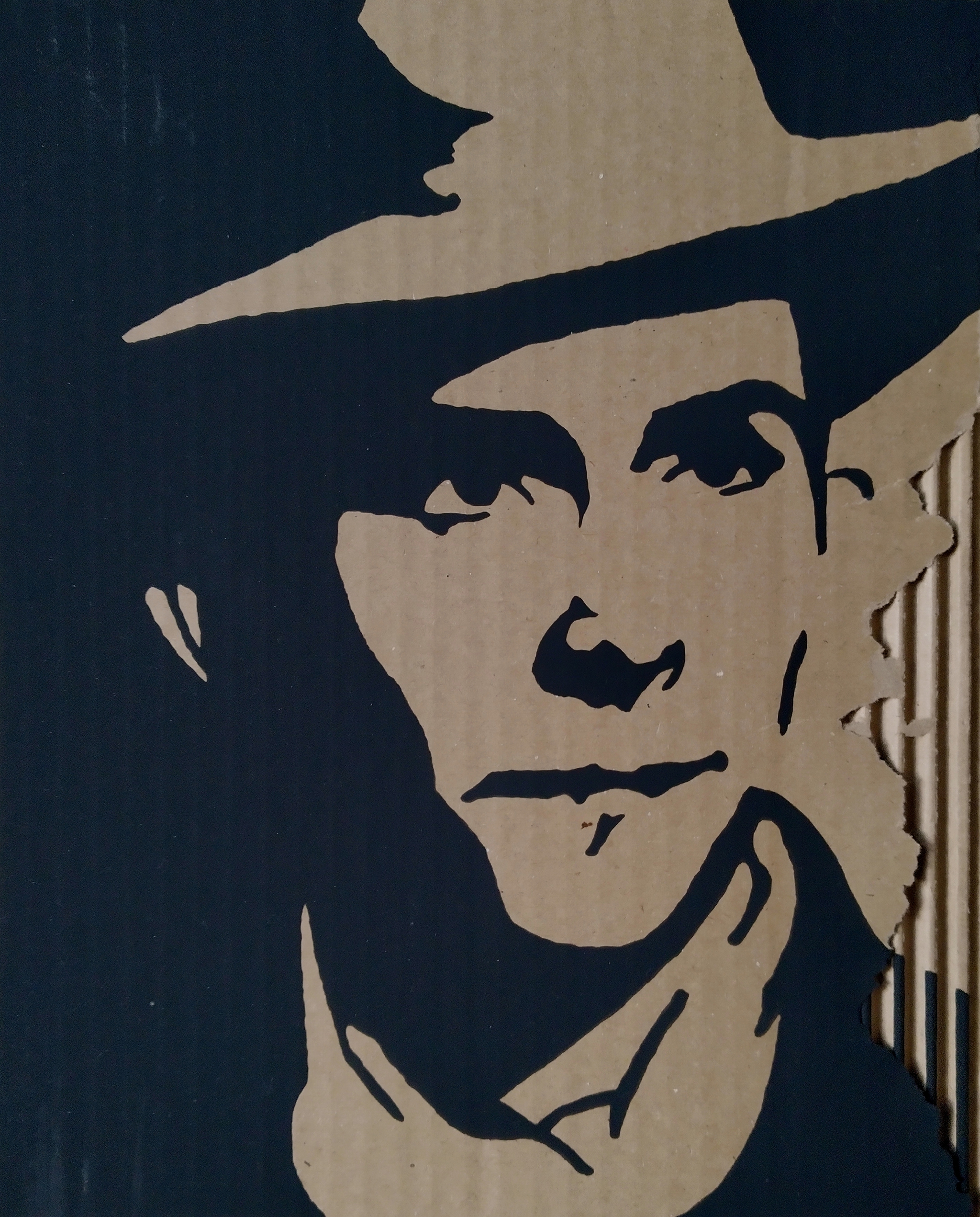 Hank Williams. Een Amerikaanse singer-songwiter die heel belangrijk was voor de countrymuziek, met een tragisch vroege dood. Dit is een zeefdruk op een oude whisky-doos, wel zo toepasselijk.