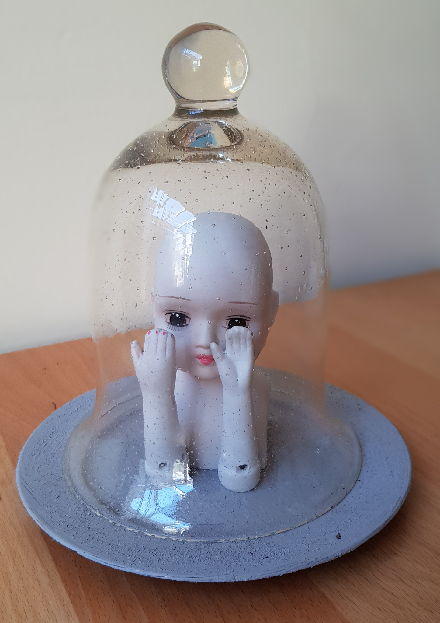 Een glazen stolp, mt daarin een expressief gezichtje met de handen ervoor. Veilig opgeborgen. De schaamtw voorbij dus.