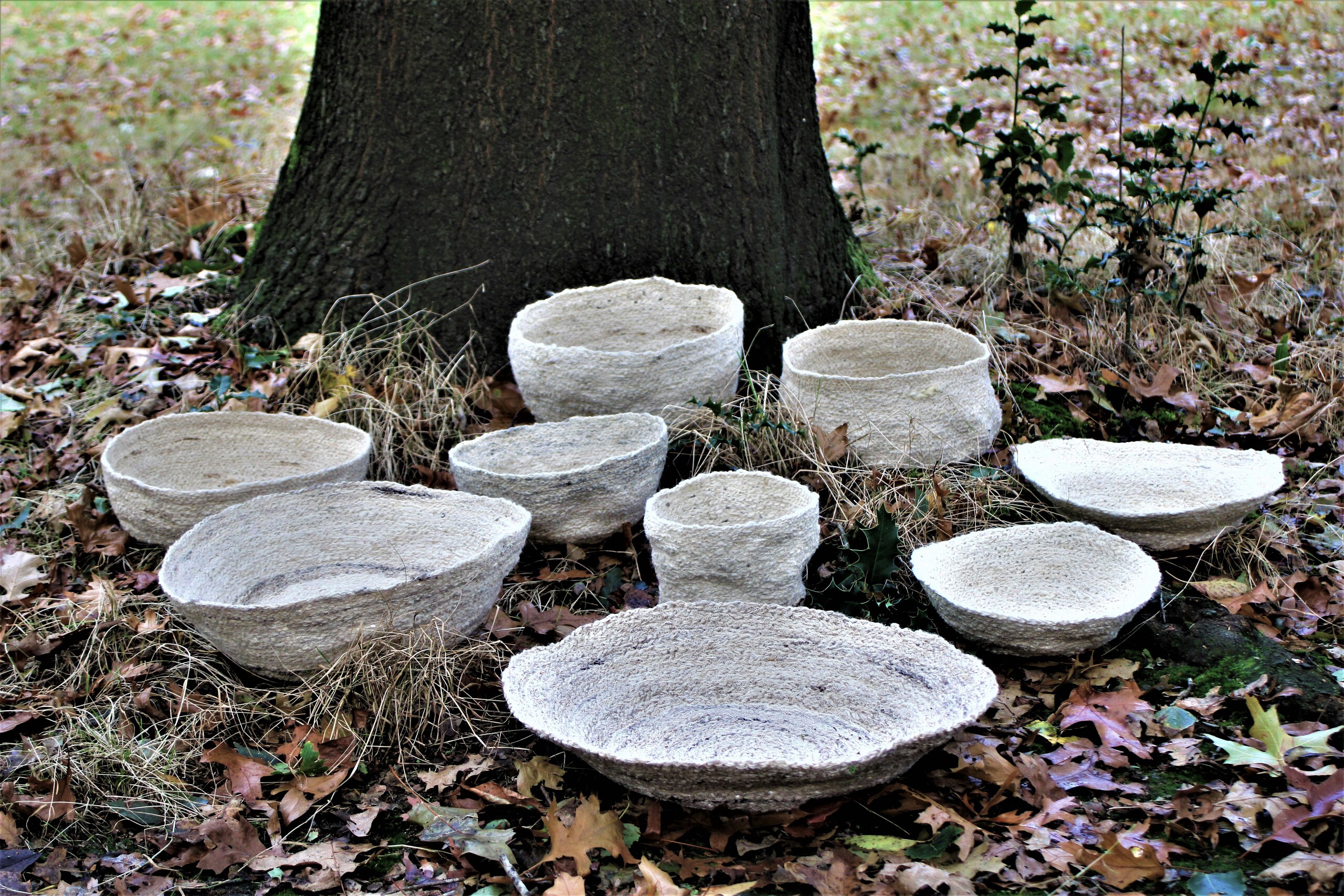 Dit werk ontstond tijdens mijn werkverblijf in Drenthe, oktober 2021. Oktober, het seizoen van verandering. Bomen laten hun vruchten en bladeren langzaamaan vallen. Ik zie een Vlaamse gaai druk bezig met verzamelen en verstoppen van zijn wintervoorraad. Hoe zit het met mijn wintervoorraad? Voor mijn voorouders was het van levensbelang om hun wintervoorraad van het land te halen en veilig op te slaan, om de winter door te kunnen komen. Op te slaan in Keulse potten, te wecken in weckflessen. Dat brengt me bij een persoonlijke versie: ik maak potten en schalen om de vruchten van dit jaar te bewaren. Ze zijn gemaakt van wol, een van oudsher natuurlijk voorhanden materiaal. Om op te slaan wat de zomer heeft gegeven en zo de winter door te komen.