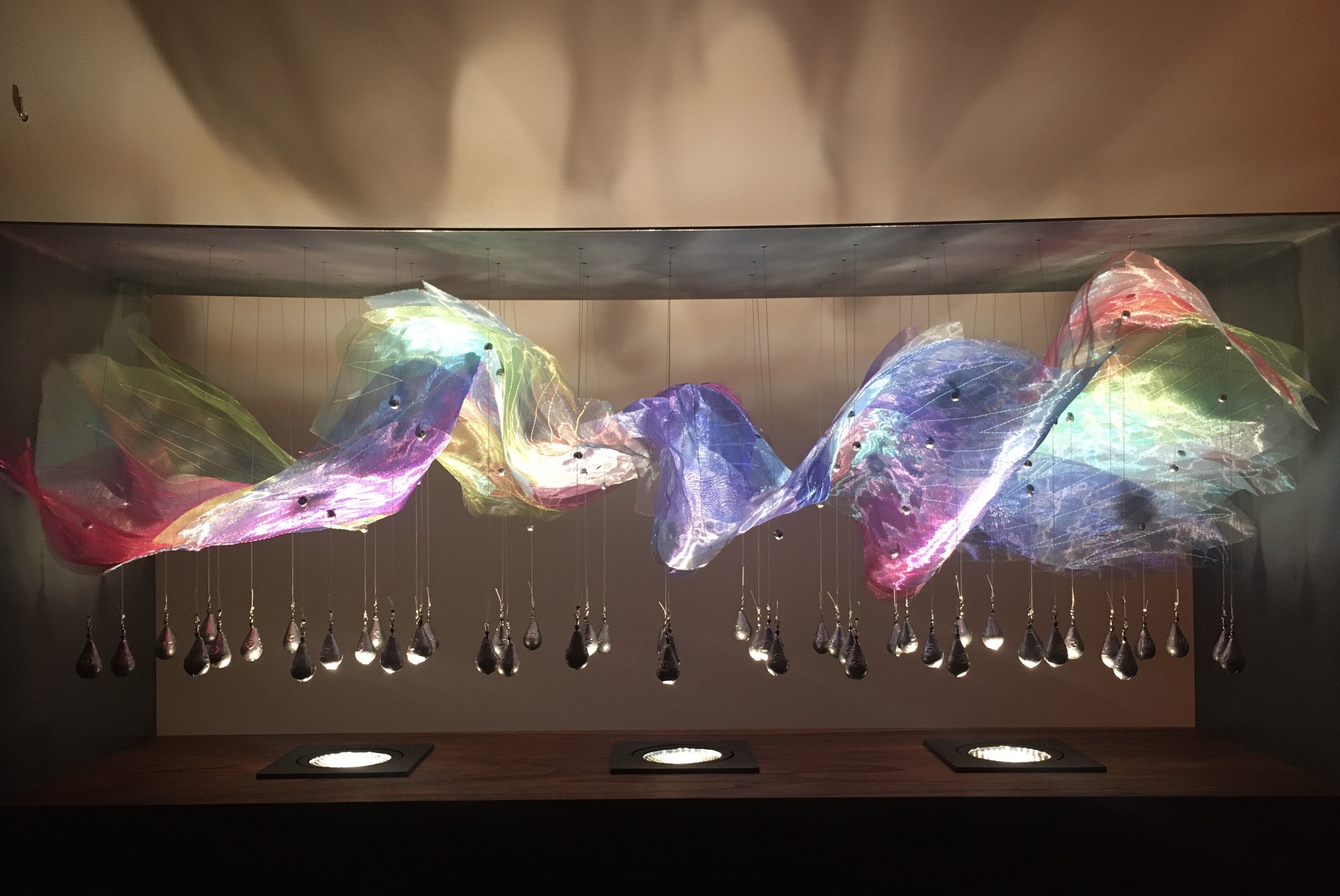Ontwerp i.s.m. Twan Oei Lichtobject Aurora is geïnspireerd op de kleuren van het Noorderlicht. De combinatie van de industriële stalen constructie met het zachte vloeiende doek geeft een sterk contrast. Het doek bestaat uit een aantal lagen bladvormige segmenten organza in verschillende kleuren. De kleuren en de naairichting van het garen zorgen voor een specifieke structuur en dragen bij aan de compositie. De staaldraden en het lood verbinden het doek en het staal. De verlichting in de notenhouten basis straalt uit op het lood en het doek en zorgt voor een betoverend effect. Materiaal: staal, lood, notenhout, led, organza, garen