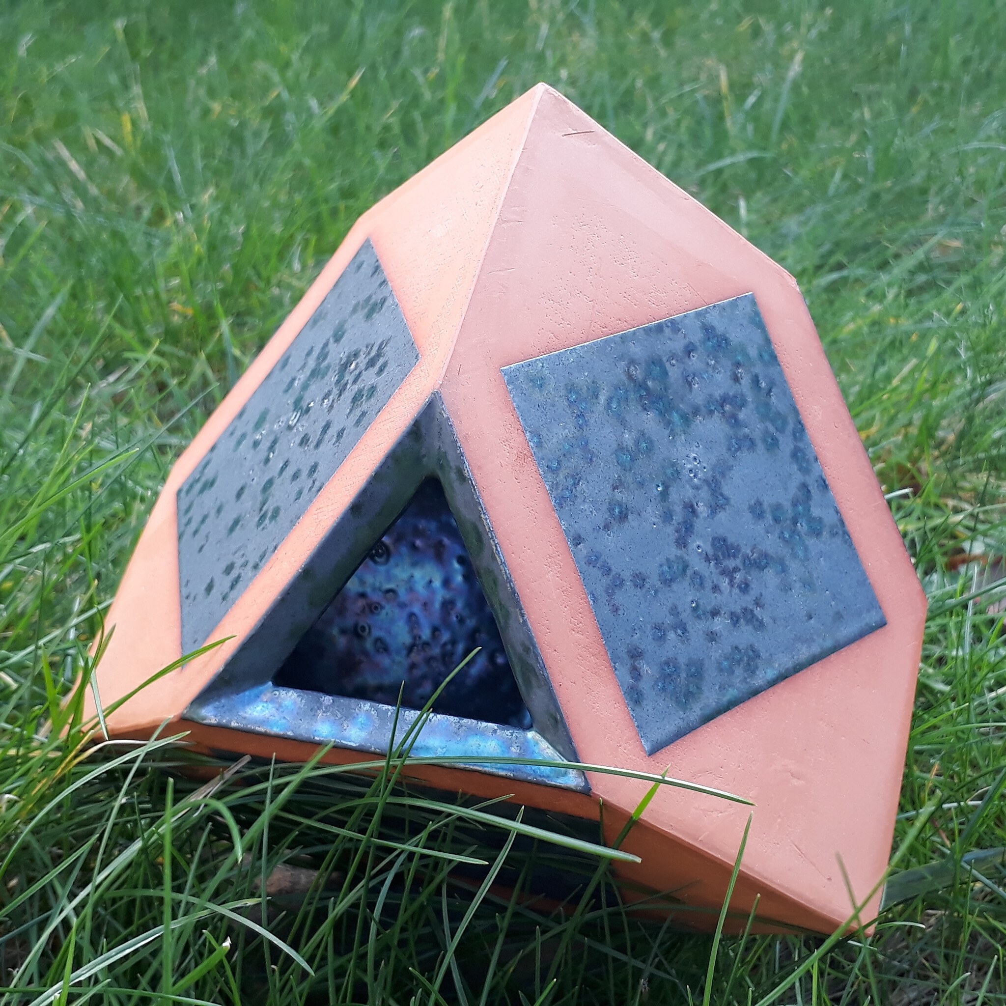 Een kubus op zijn kant, met opengesneden hoeken. Vormt een bijzondere vaasvorm of gewoon een leuk geometrisch object