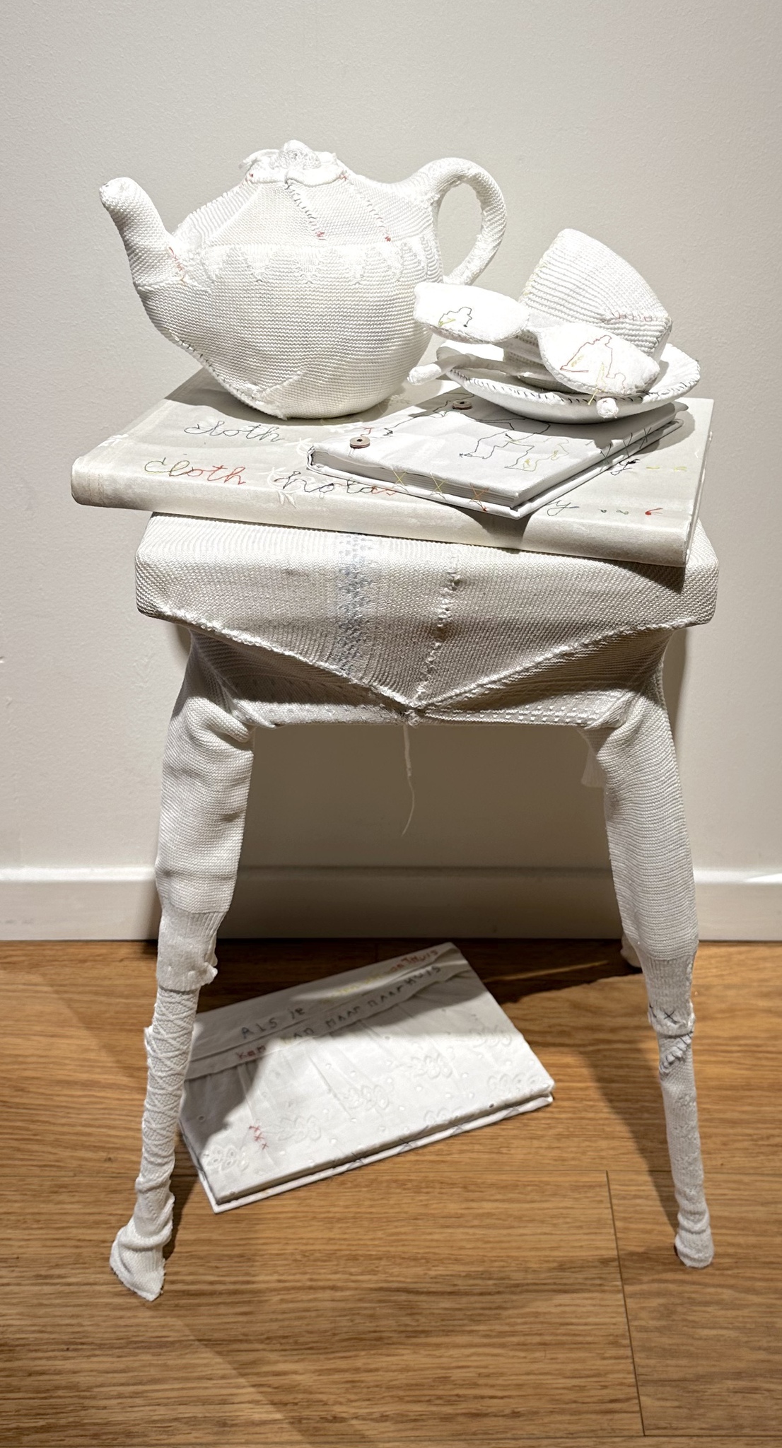 Installatie gemaakt voor expositie Thuis in textiel, genaaid van vintage kleding om een tafeltje, boeken, theepot, theekopje, bril.