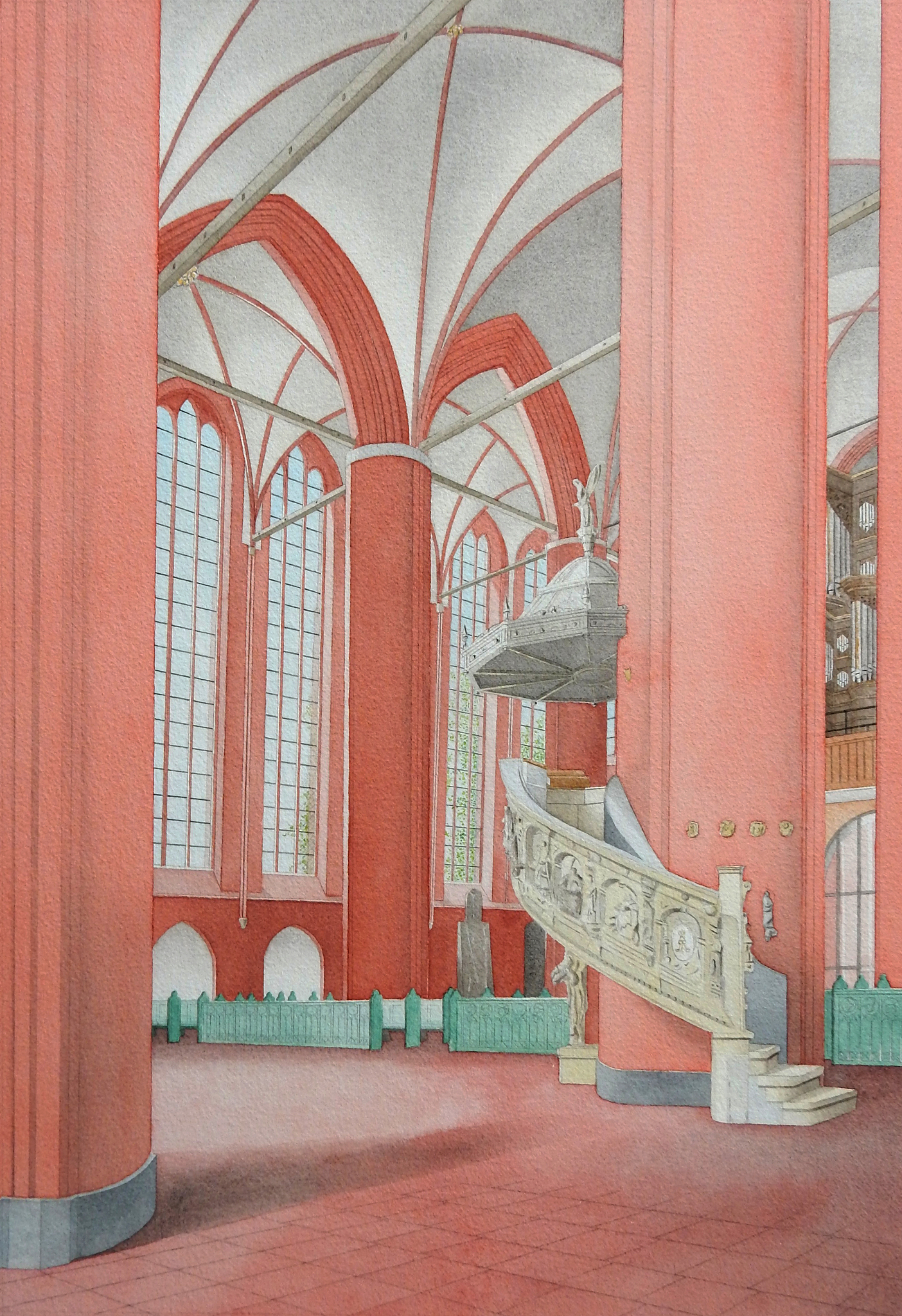 Gefascineerd van jongs af voor alles wat te maken heeft met oude kerkgebouwen. Spannende bouwwerken met vele fraaie hoekjes, doorkijkjes en als je geluk hebt een schitterend orgel met een goede organist die tijdens het tekenen musiceert.