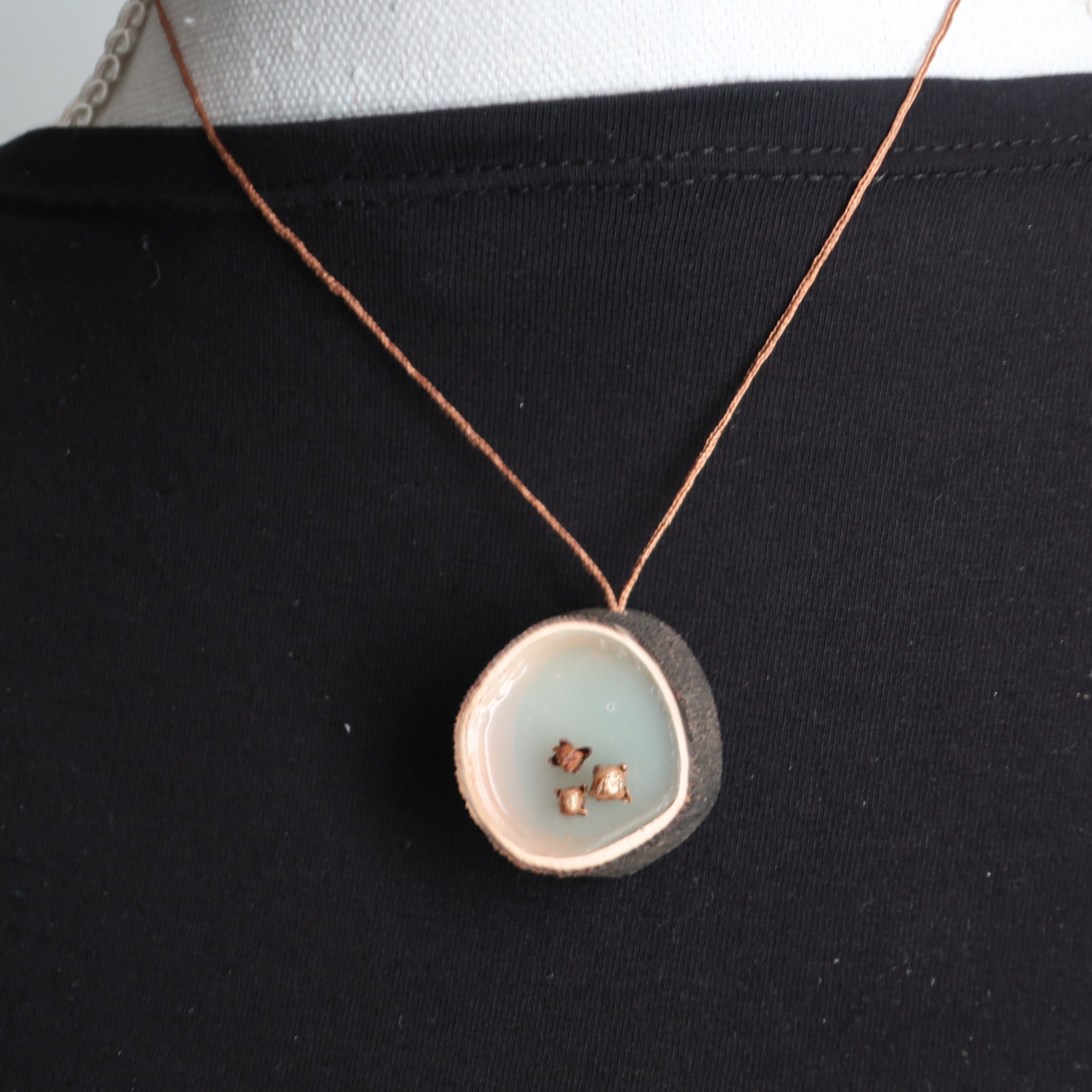 Indische Pracht van Dennis A-Tjak was de inspiratiebron voor deze hanger. In gedroogd kelp (bruine algensoort) hebben we een vlies aangebracht waarin kruidnagels zijn gestoken. Om de hanger aan de draad te bevestigen is ook een kruidnagel gebruikt. De draad is in lengte verstelbaar.