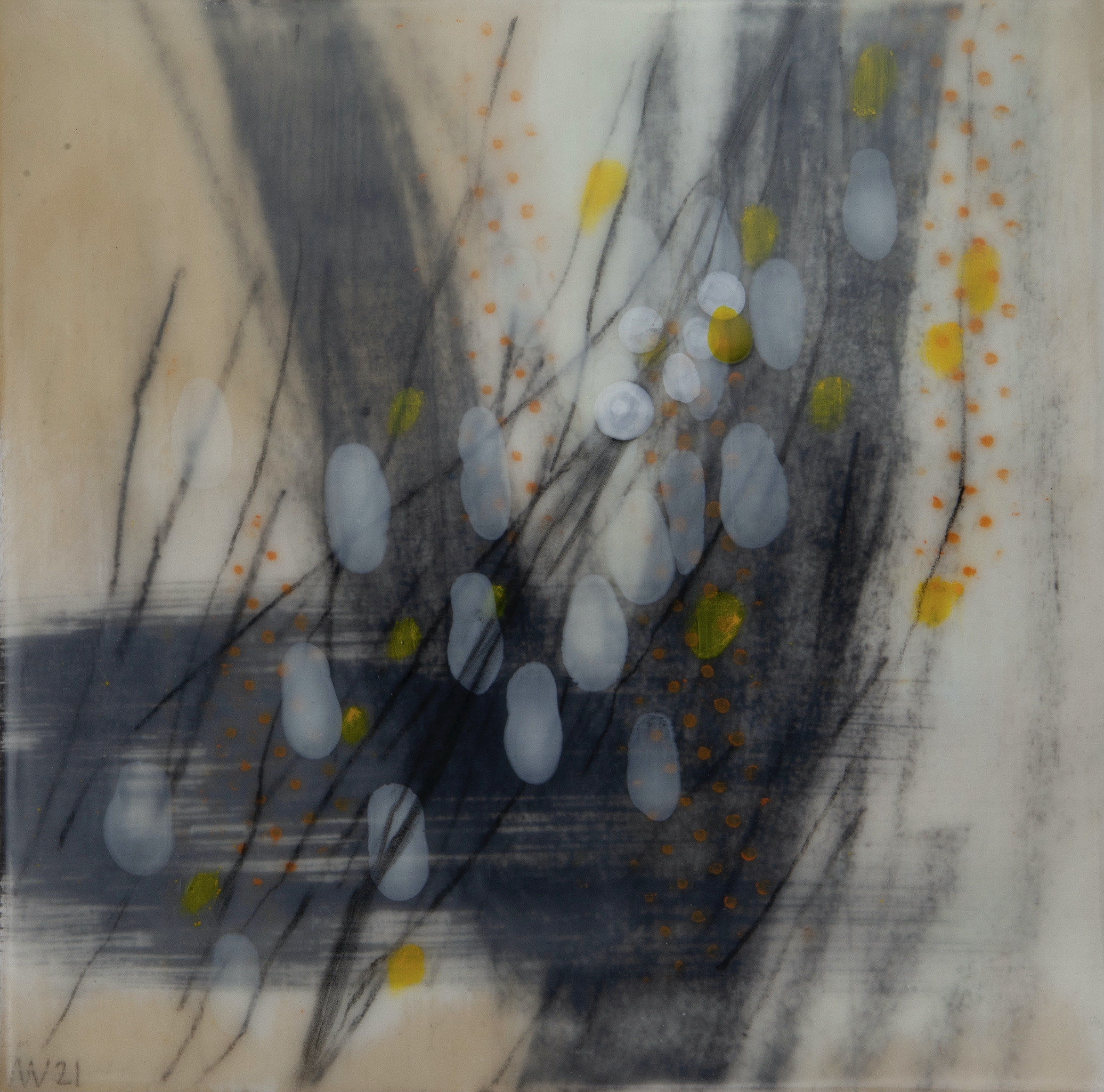 Inkt, potlood, houtskool, panpastel en encaustiek op paneel.
