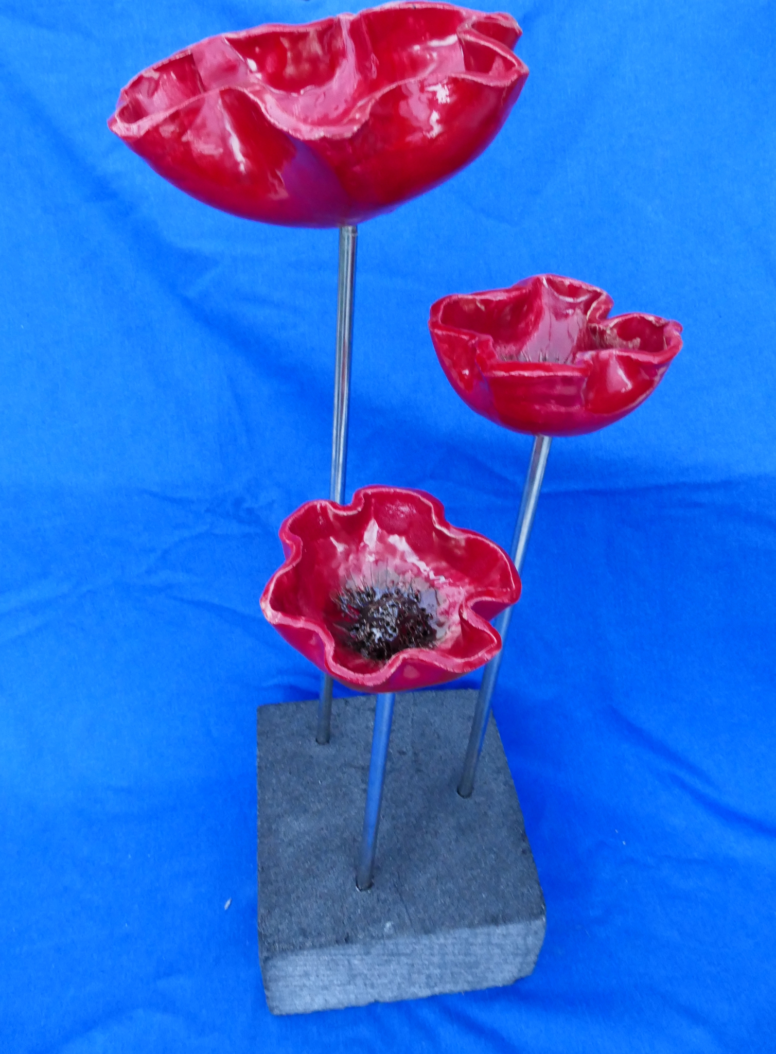 klaprozen op RVS steel die ook apart in de tuingrond in de tuin gezet kunnen worden.