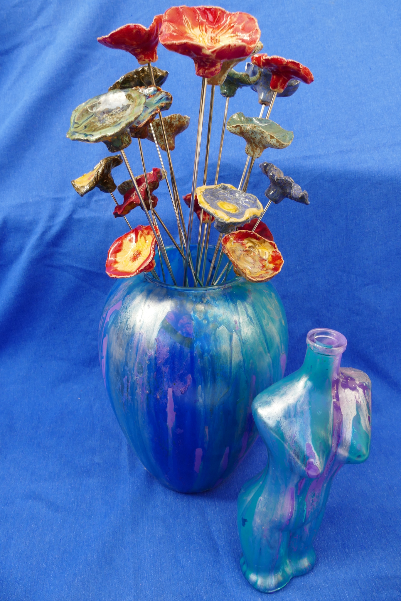 glazen bloemenvaas met kleine kleurige bloemen en glazen vrouwenfiguur