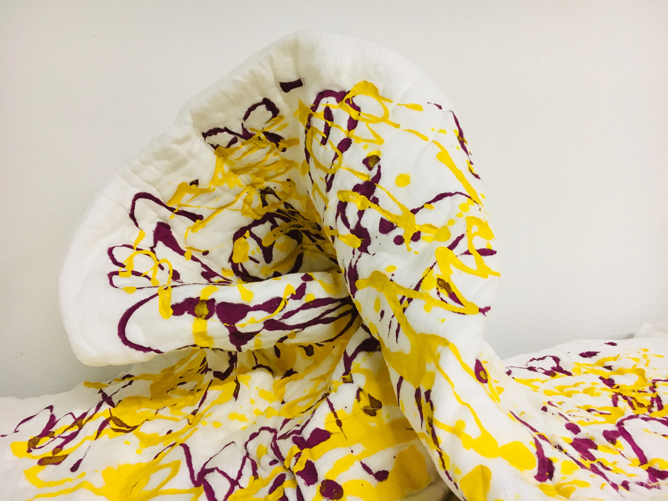 Serie: "Vida" Obra que simboliza la fragilidad de la "Vida" Pintura al acrílico color Magenta y Amarillo sobre gasa de 150 x 50 x 3 cm La palabra "Vida" se repite en diferentes direcciones imnpregandose en la absorbente gasa. Esta obra se puede presentar como una pintura 2D o como una escultura modelada a gusto del observador.