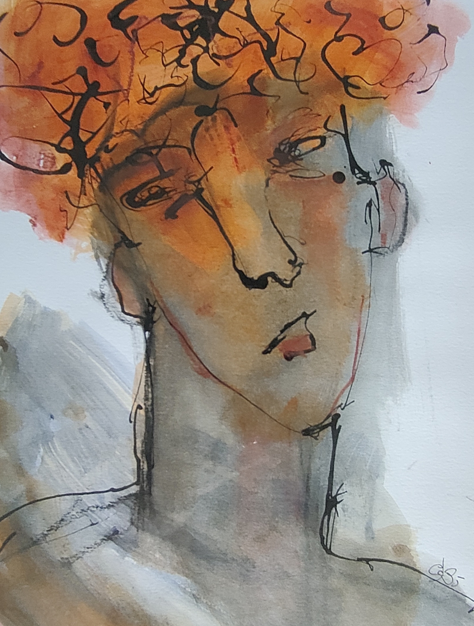 Abstract portret in acryl met tekenlijnen van inkt