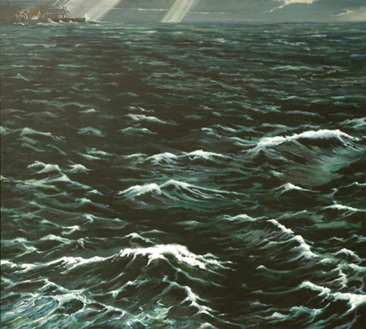 In 2009 liep ik in grijs winterweer door de kale akkers en zag in de verte Schokland liggen. Nog nooit in een polder zó sterk het gevoel gehad dat ik liep waar vroeger de zee was. Dat was de aanleiding dat ik thuis begonnen ben aan een groot doek over deze ervaring - met een historisch trekje. Het schilderij hangt nu in de raadszaal van het gemeentehuis Noordoostpolder.