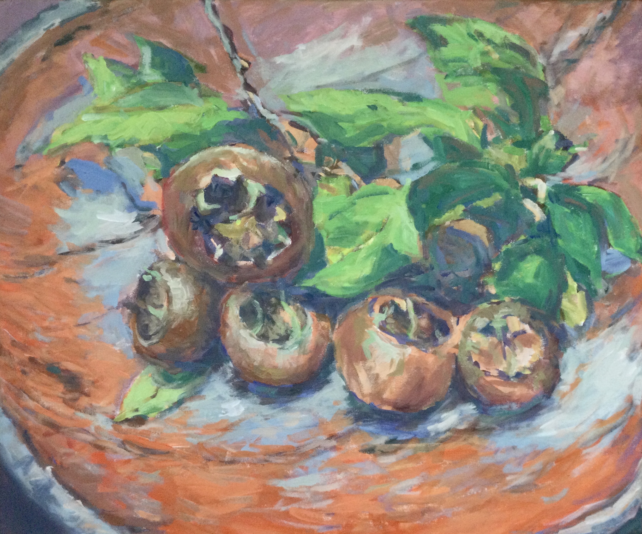 Mispels op oranje houten schaal