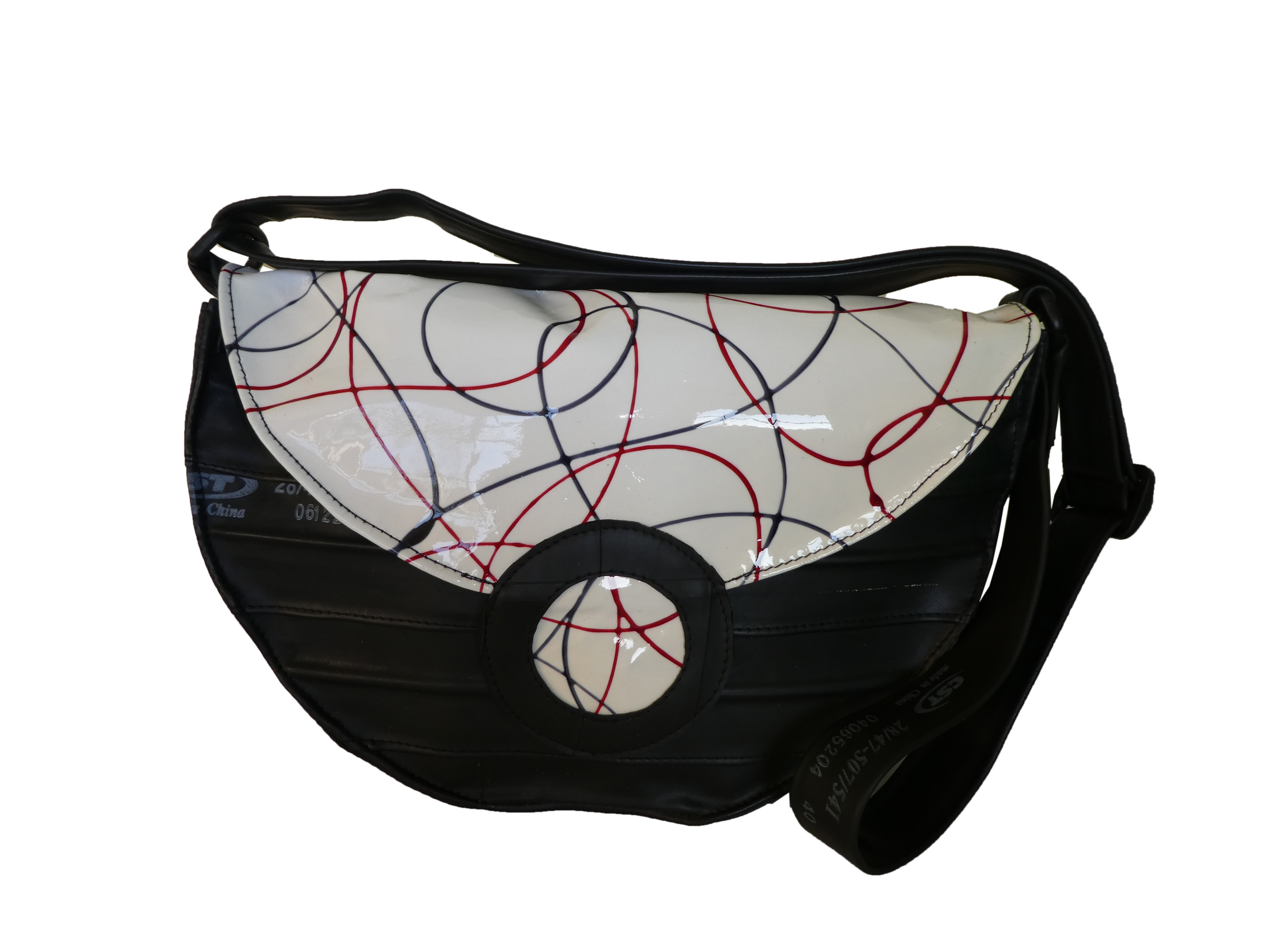 Deze duurzame tas is gemaakt van gerecycled fietsbinnenbanden in combinatie met leer. Het lakleer is gebruikt voor de klep en heeft rode en grijze cirkels op een witte achtergrond. De tas gaat dicht met een magneetsluiting en is gevoerd met heavy duty grijs nylon en heeft 2 binnenvakken met opvallende rode ritsen. Her en der vind je de opdrukken van de originele fietsbinnenband terug made in China, maar deze unieke tas is toch echt Dutch Design. De vorm doet denken aan een halve maan. Dat is weer eens wat anders!