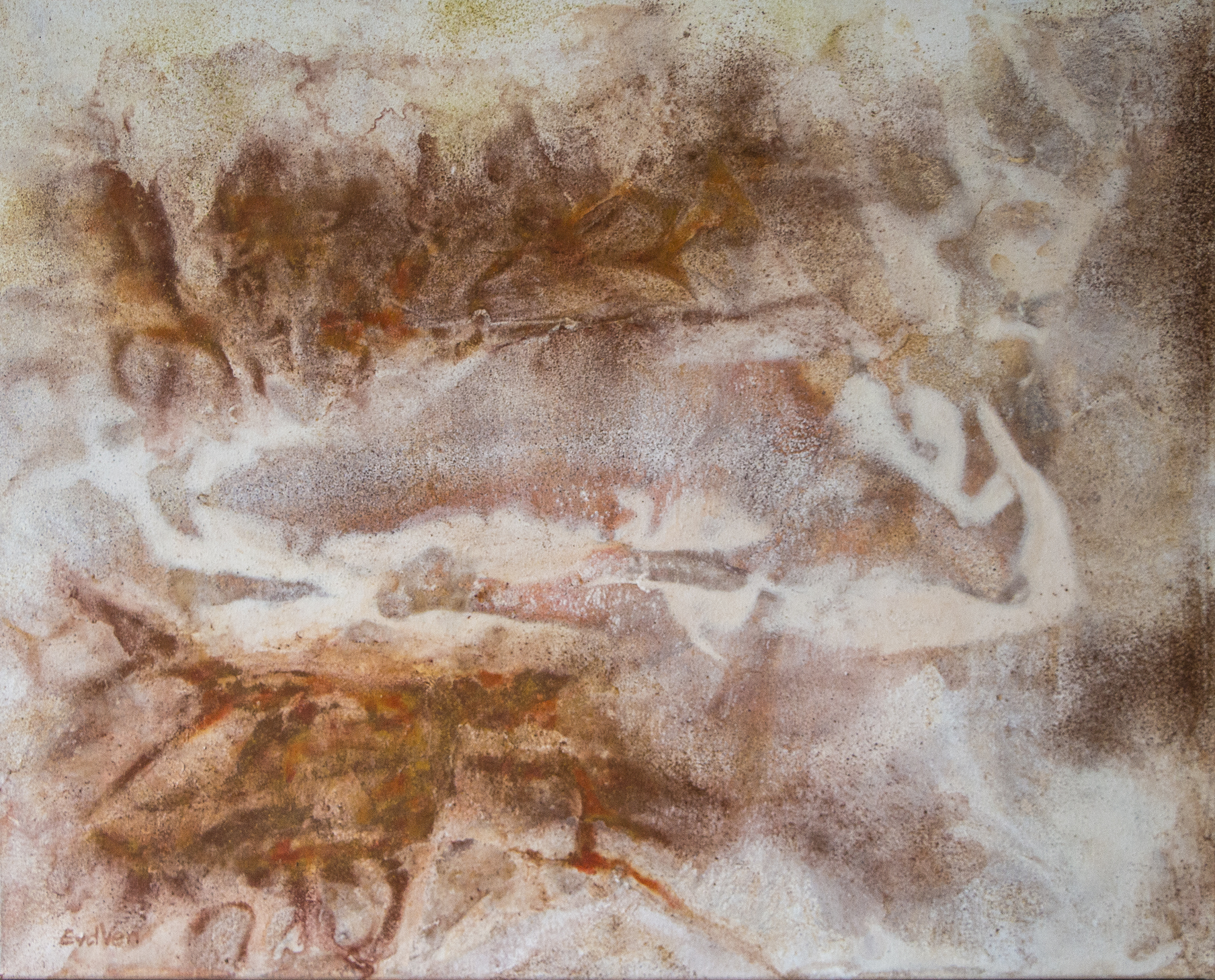 Schilderijen als wandelingen in een fictief landschap: natuurelementen die op elkaar inspelen, al dan niet met menselijke ingrepen.