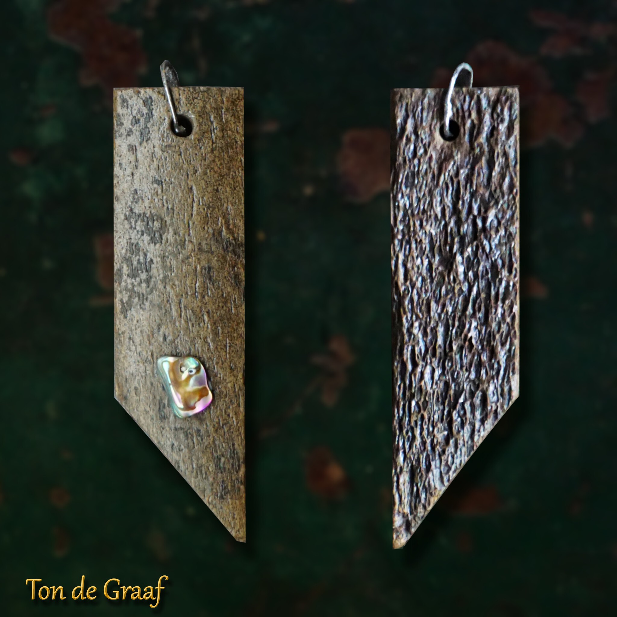 hanger gemaakt van een fossiel met daarop parelmoer, de fossiel was gevonden op de maasvlakte en het parelmoer komt uit Australië